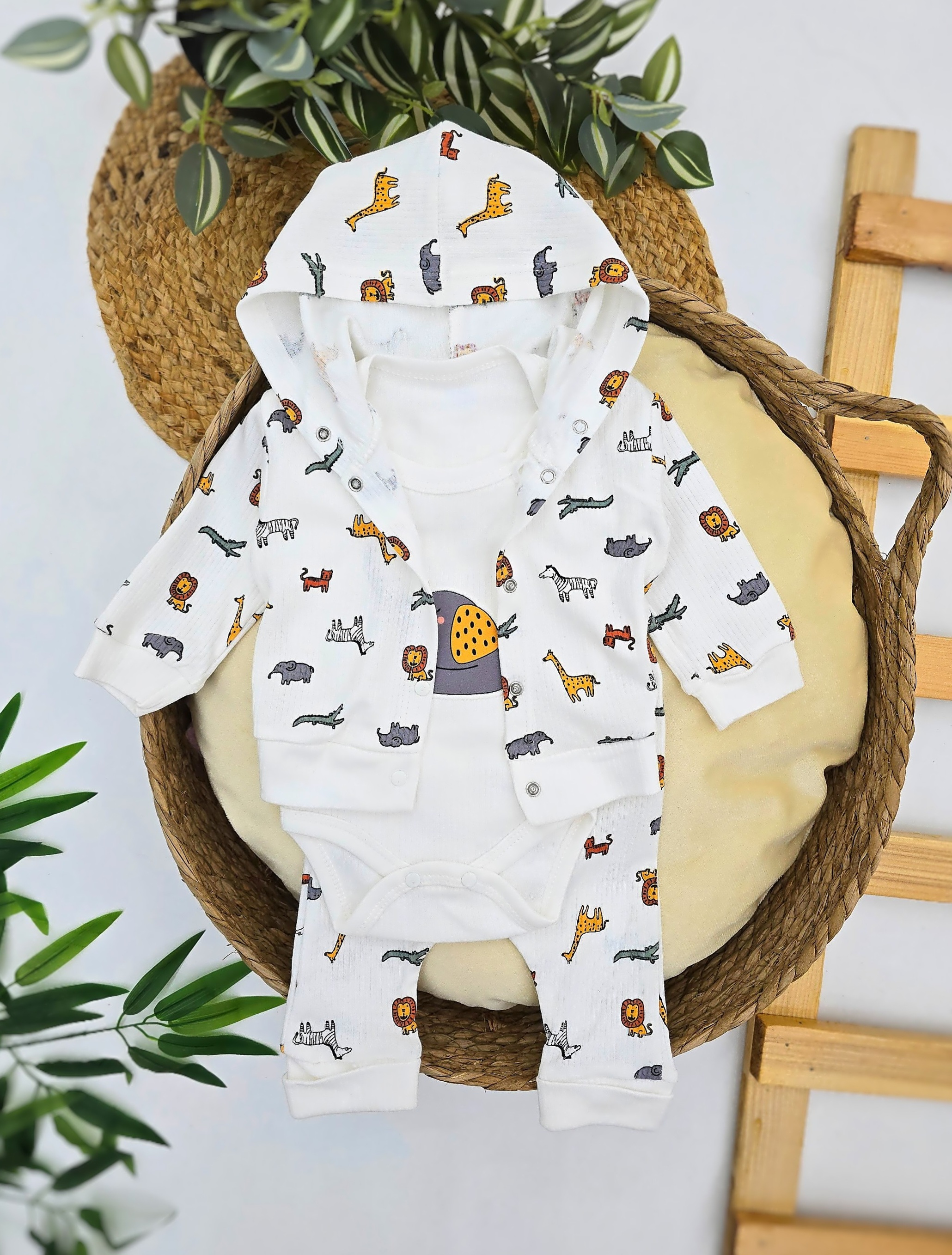 Informacije o proizvodu "Bebi set sa životinjicama – duks sa kapuljačom, bodi i donji deo"