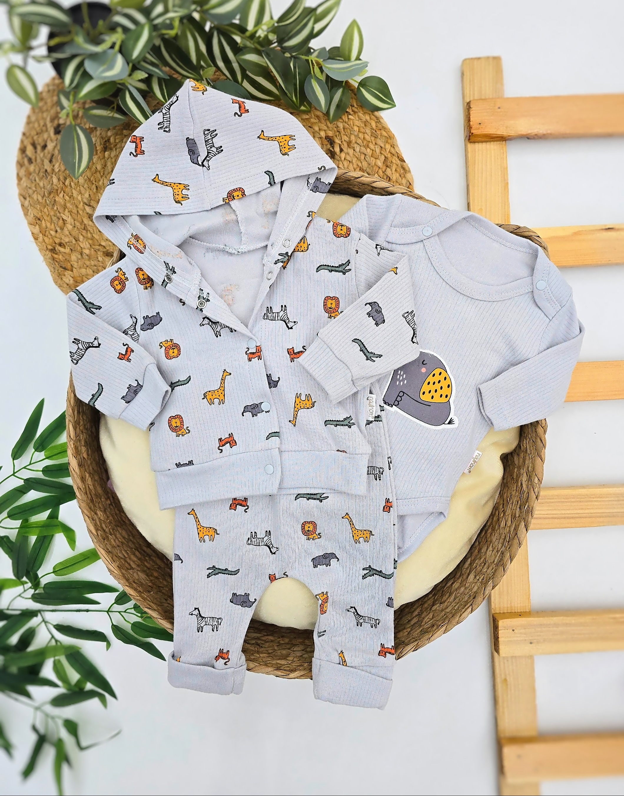 Presladak bebi set od 100 % pamuka u sivoj boji sa razigranim dezenom životinjica, savršen za udobne i tople kombinacije tokom dana. Set čine duks sa kapuljačom, bodi sa simpatičnom ilustracijom slonića i donji deo u istom veselom dezenu. Mekan, praktičan i prijatan za nošenje, idealan za svakodnevne aktivnosti i prve bebine dane.Zemlja porekla: Turska Distributer: Vavik 1805 dooNačin održavanja: prema ušivenoj etiketi proizvođača Kvalitet kontrolisao: Profi lab Beograd Proizvođač: Muratbaby