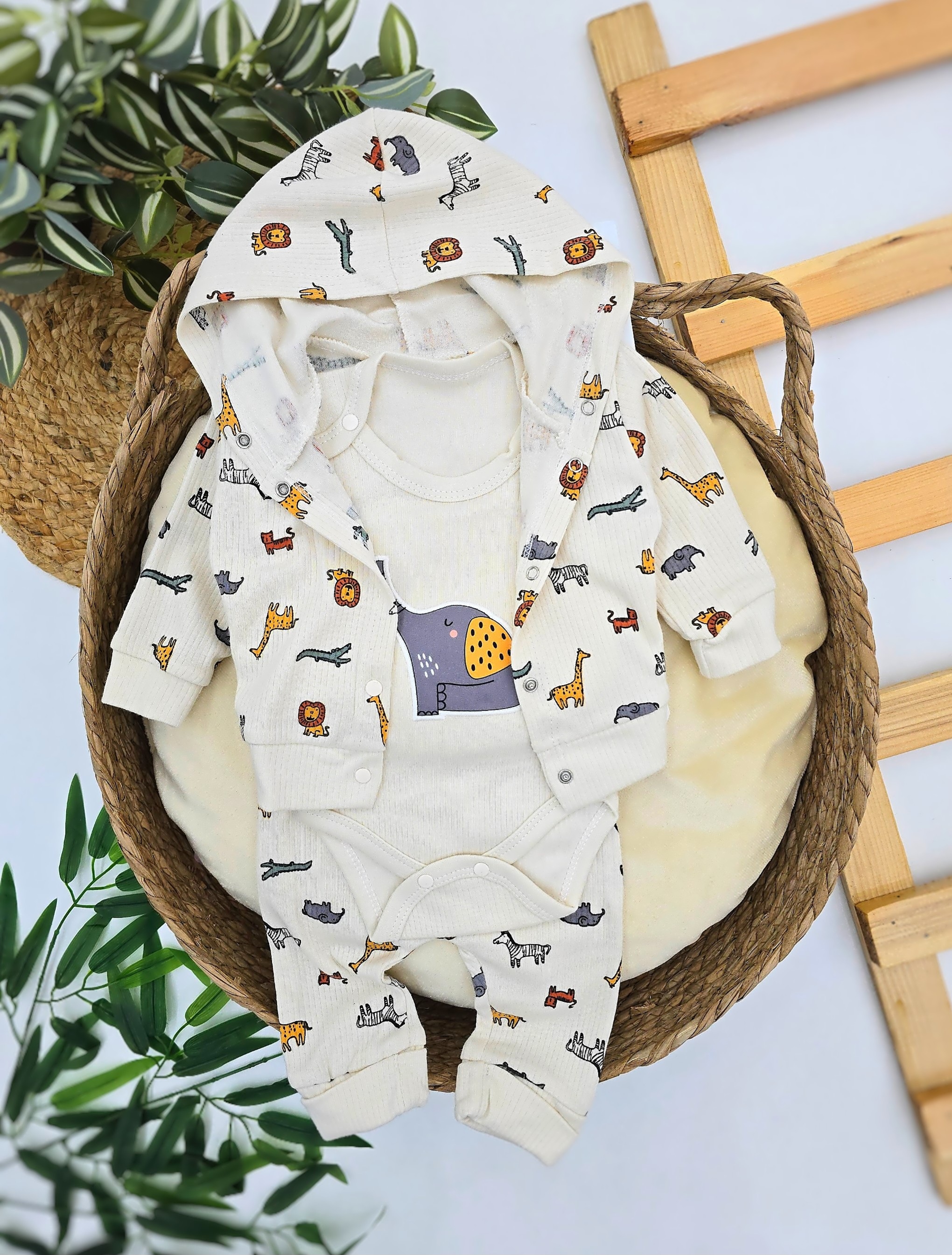 Nežan bebi set od 100 % pamuka u svetlo krem boji sa preslatkim dezenom životinjica, idealan za prve dane i svakodnevne trenutke sa bebom. Set sadrži duks sa kapuljačom, bodi sa simpatičnom ilustracijom slonića i donji deo u istom razigranom dezenu. Prijatan, mekan i praktičan, savršen je za udobnost bebe i nežan, moderan izgled.