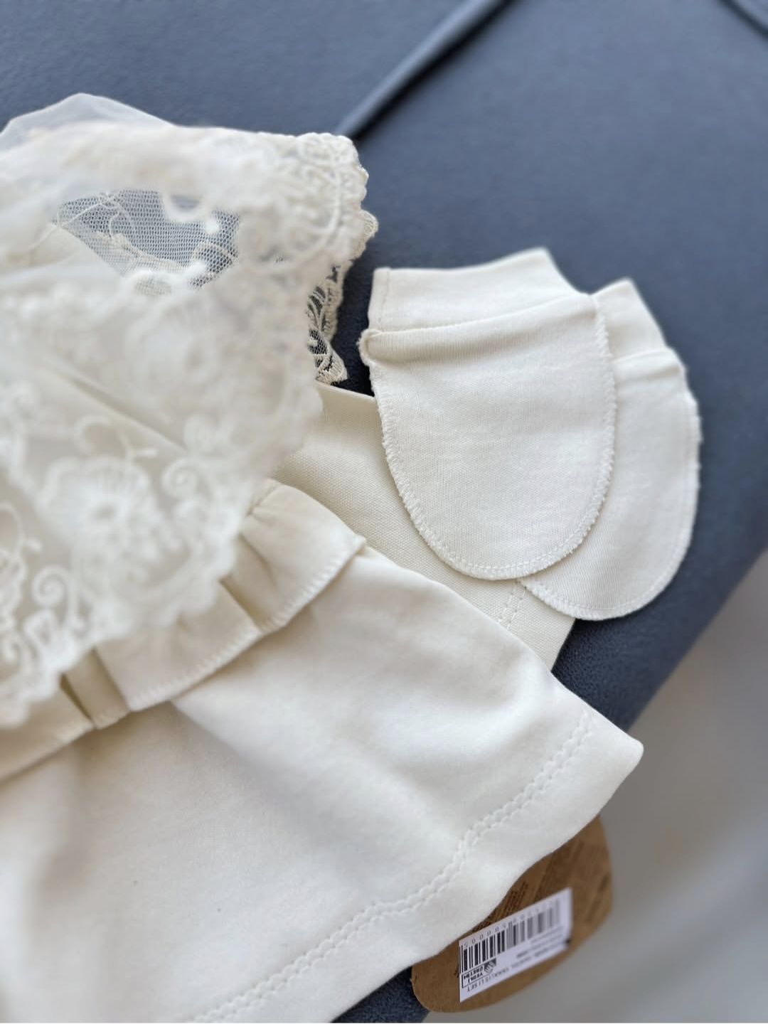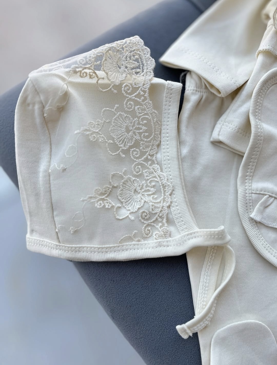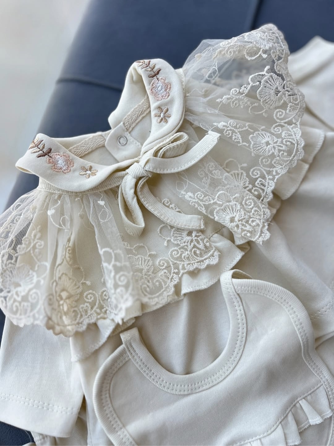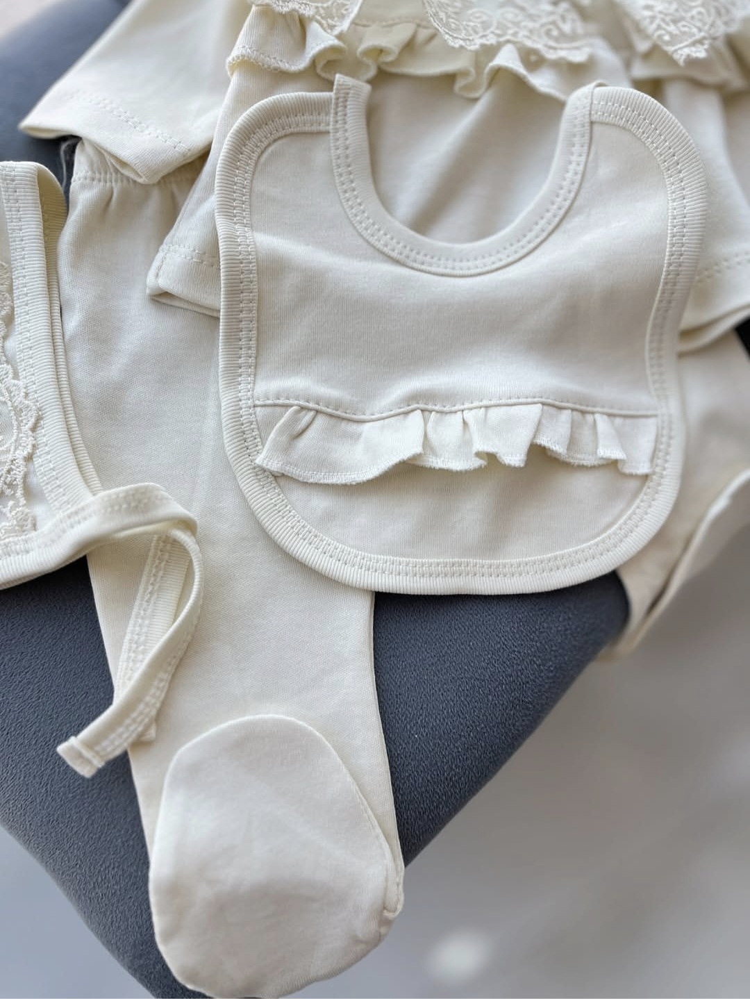 Prelep šestodelni set za novorođenče u nežnoj svetlo krem boji 🤍. Komplet sadrži bluzicu sa ukrasnom čipkastom kragnom, pantalonice sa stopicama, kapicu sa čipkastim detaljima, portiklu i rukavice. Idealno za prve dane bebe, izlazak iz porodilišta ili kao poklon za novorođenče. Materijal je nežan i udoban, savršen za osetljivu bebinu kožu. 100 % pamuk