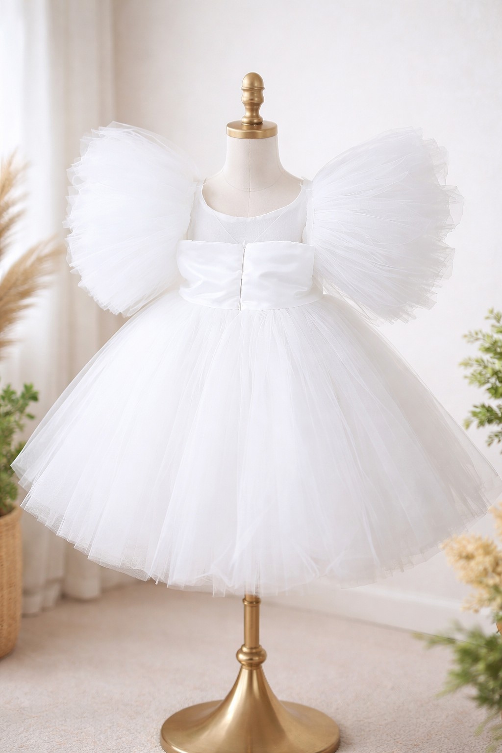 Elegantna bela flamingo haljinica za devojčice, sa bogatim slojevima tila i upečatljivim puf rukavima, u kompletu sa rajfom za kosu. Savršena za svečane prilike, krštenja, rođendane ili fotografisanja. Udobna i lagana, pruža osećaj kao iz bajke. Dizajnirana za male princeze koje žele da zablistaju.