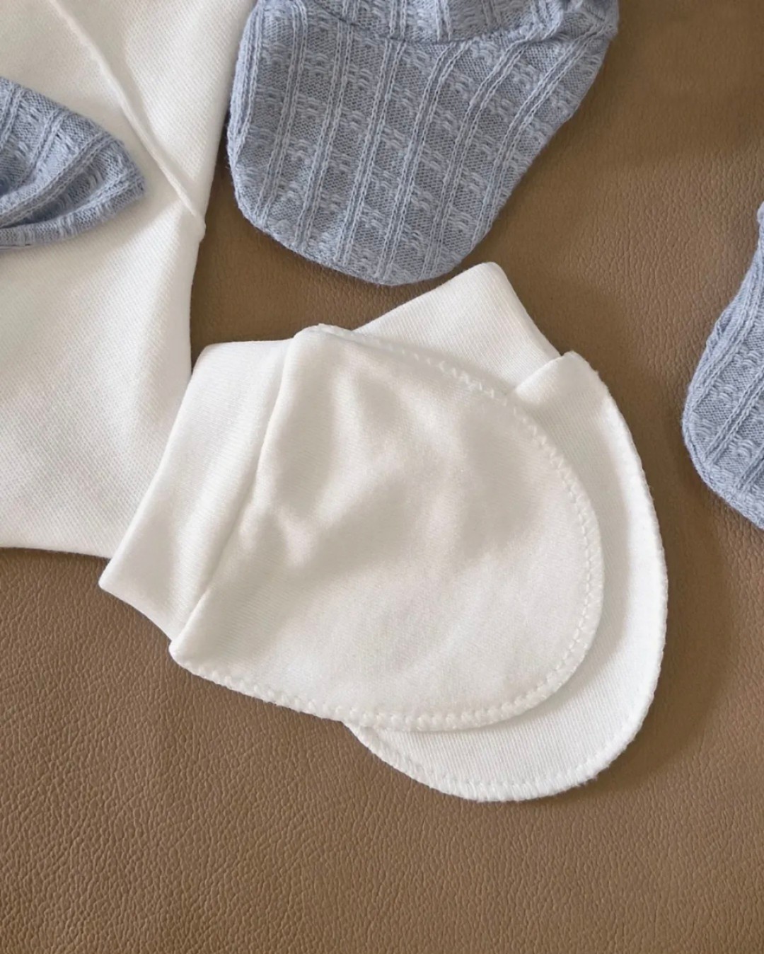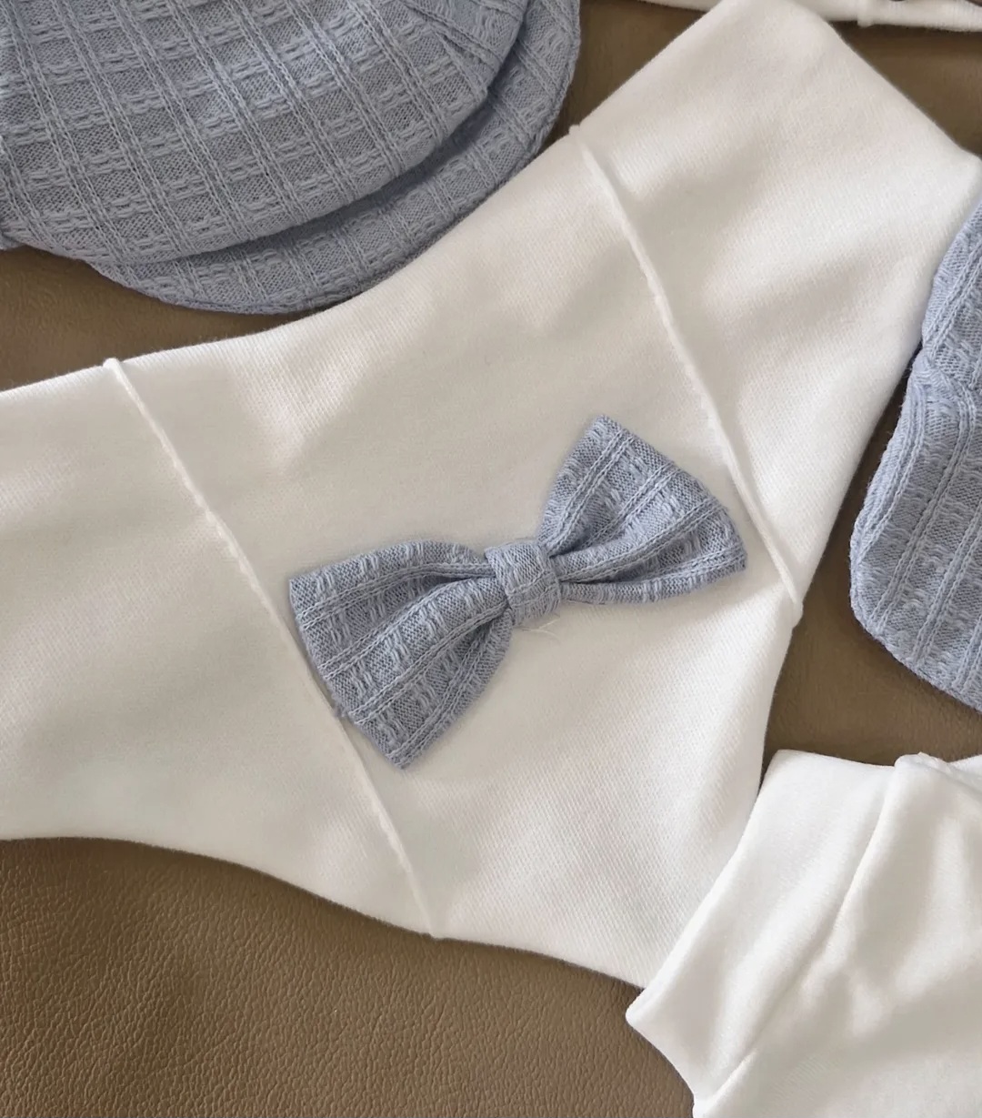 Ovaj predivan petodelni set za novorođenče sadrži benkicu sa izvezenim medom i drvenim dugmićima, udobne pamučne pantalone, beretku, portiklu i rukavice u tonovima bele i svetloplave.