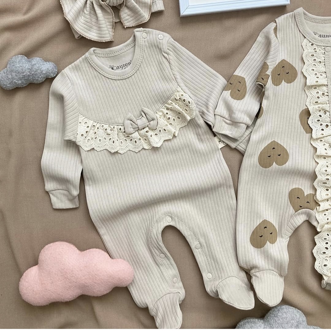 Nežno osmišljen četvorodelni bež set za bebe od 100 % pamuka, ukrašen suptilnim srce dezenom koji unosi toplinu i romantiku u svaki detalj. Set sadrži dva udobna kombinezona, turban i traku za kosu, savršeno uklopljene za prve dane, svakodnevno nošenje ili posebne trenutke. Harmonični tonovi i fini detalji čine ovaj set idealnim izborom i kao poklon.