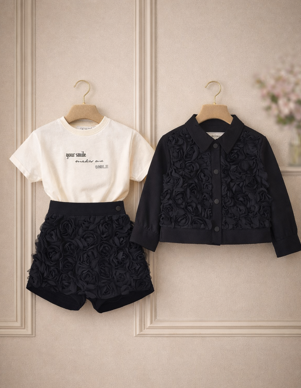 Informacije o proizvodu "Crni komplet za devojčice – teksas jaknica i šorts sa 3D ružama + majica"
