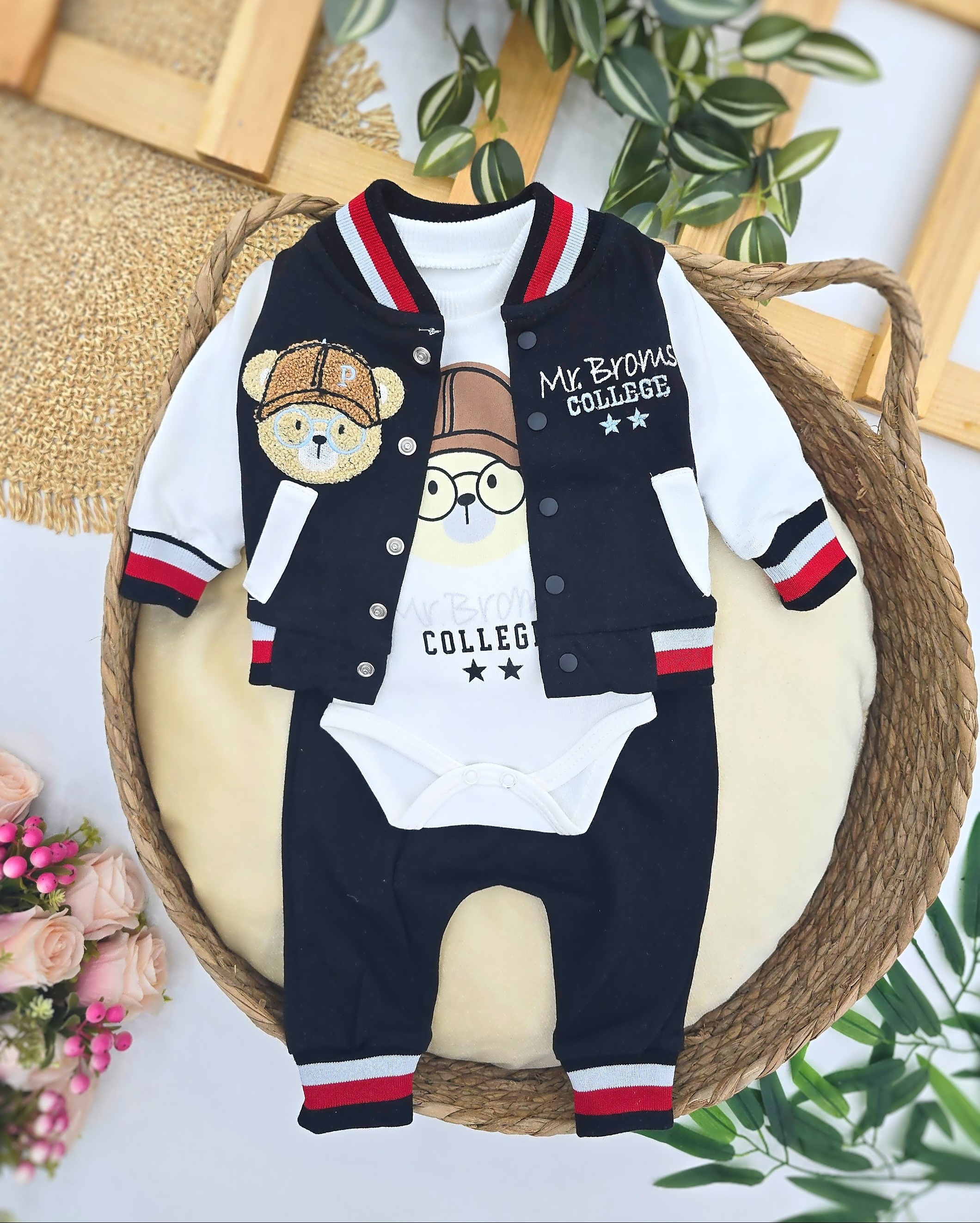 Moderan i udoban set za bebe dečake od 100 % pamuka, koji se sastoji od koledž duksa sa preslatkim motivom mede, bodija i pantalonica. Idealan za svakodnevno nošenje, šetnje i poklon, uz spoj sportskog stila i udobnosti prilagođene bebama.