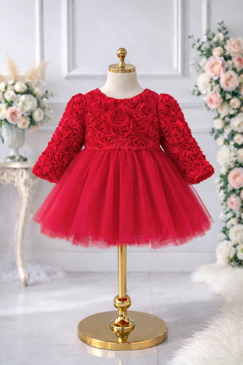 Efektna crvena svečana haljinica za devojčice, bogato ukrašena 3D ružama i velikom til mašnom na leđima ❤️