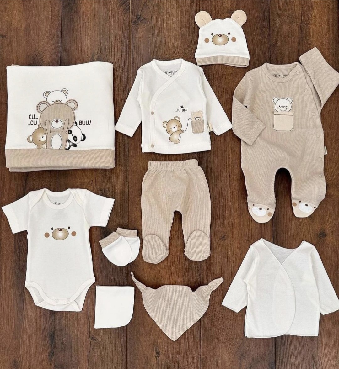 Praktičan i neodoljiv desetodelni set za novorođenče u neutralnim bež i belim tonovima. Idealan za izlazak iz bolnice i prve dane kod kuće. Set sadrži sve što je potrebno: kombinezon, bodi, pantalone, bluzicu, benkicu, portiklu, kapicu sa ušima, rukavice, maramicu i prekrivač. Napravljen od mekanog i nežnog pamuka, savršen za osetljivu bebinu kožu.