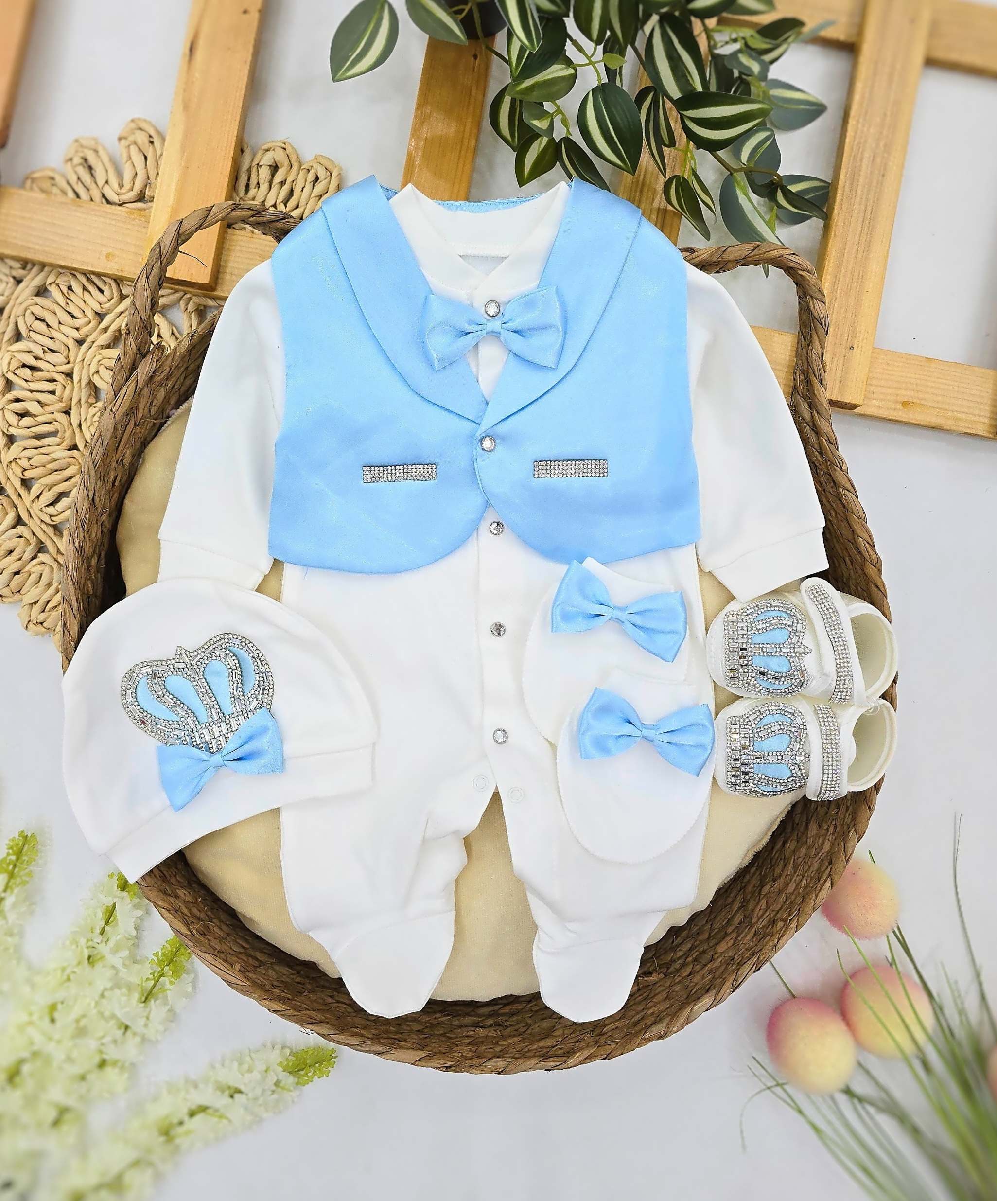 Svečani set za novorođenče u nežnoj svetlo plavoj boji, idealan za prvi izlazak iz porodilišta, posebne prilike ili kao poklon. Komplet sadrži beli kombinezon, elegantan prsluk u svetlo plavoj boji, ukrašene cipelice, kapicu sa krunom i rukavice sa mašnicama. Udoban, mekan i luksuzno dizajniran – pravi izbor za malog princa.