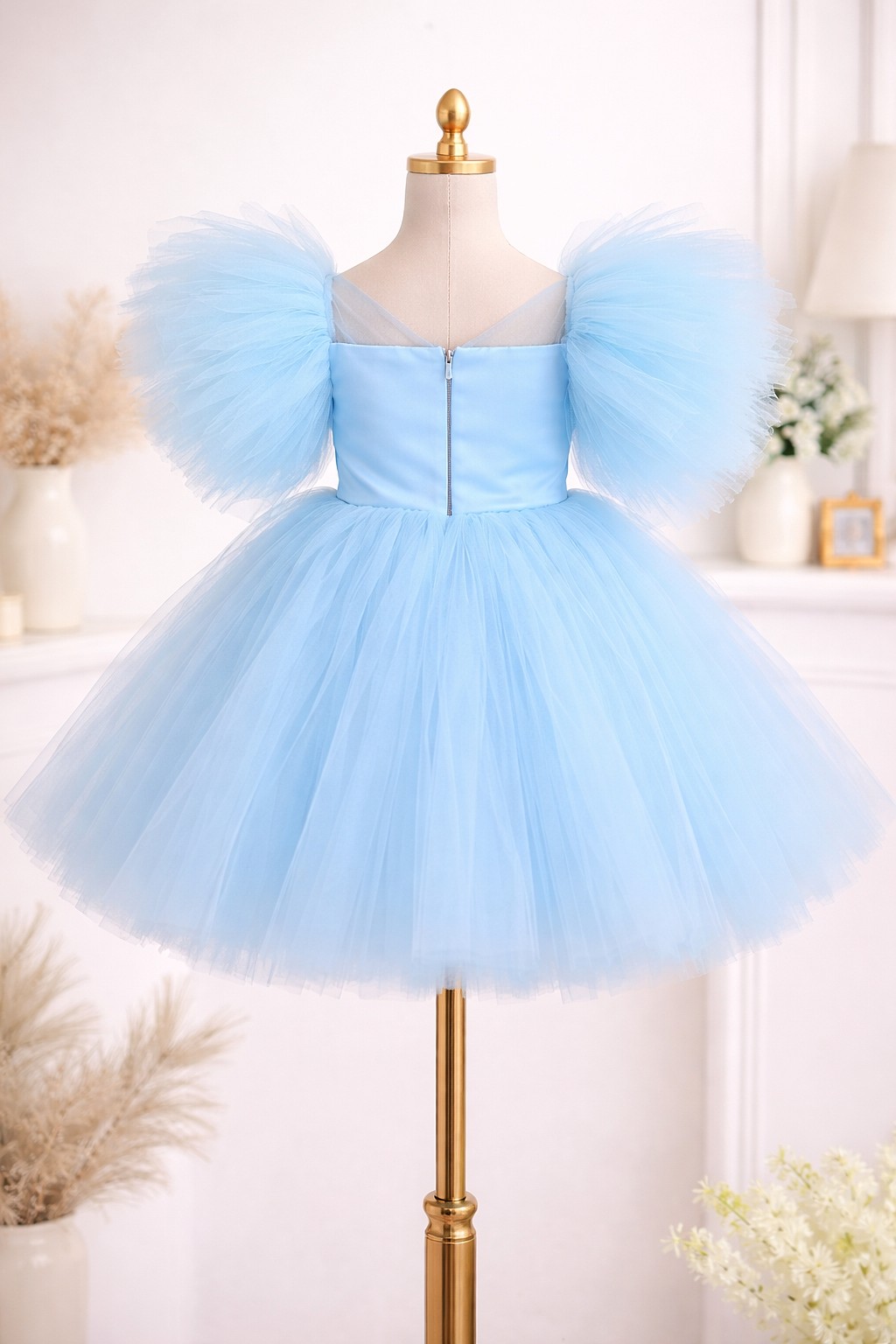 Predivna svetlo plava flamingo haljinica za devojčice sa puf rukavima od tila i slojevitom suknjom koja stvara bajkoviti efekat. Uz haljinu dolazi i rajf sa cvetićima i biserima, savršen za rođendane, fotografisanja ili svečane prilike. Udobna, lagana i nežna na dodir – idealna za male princeze.