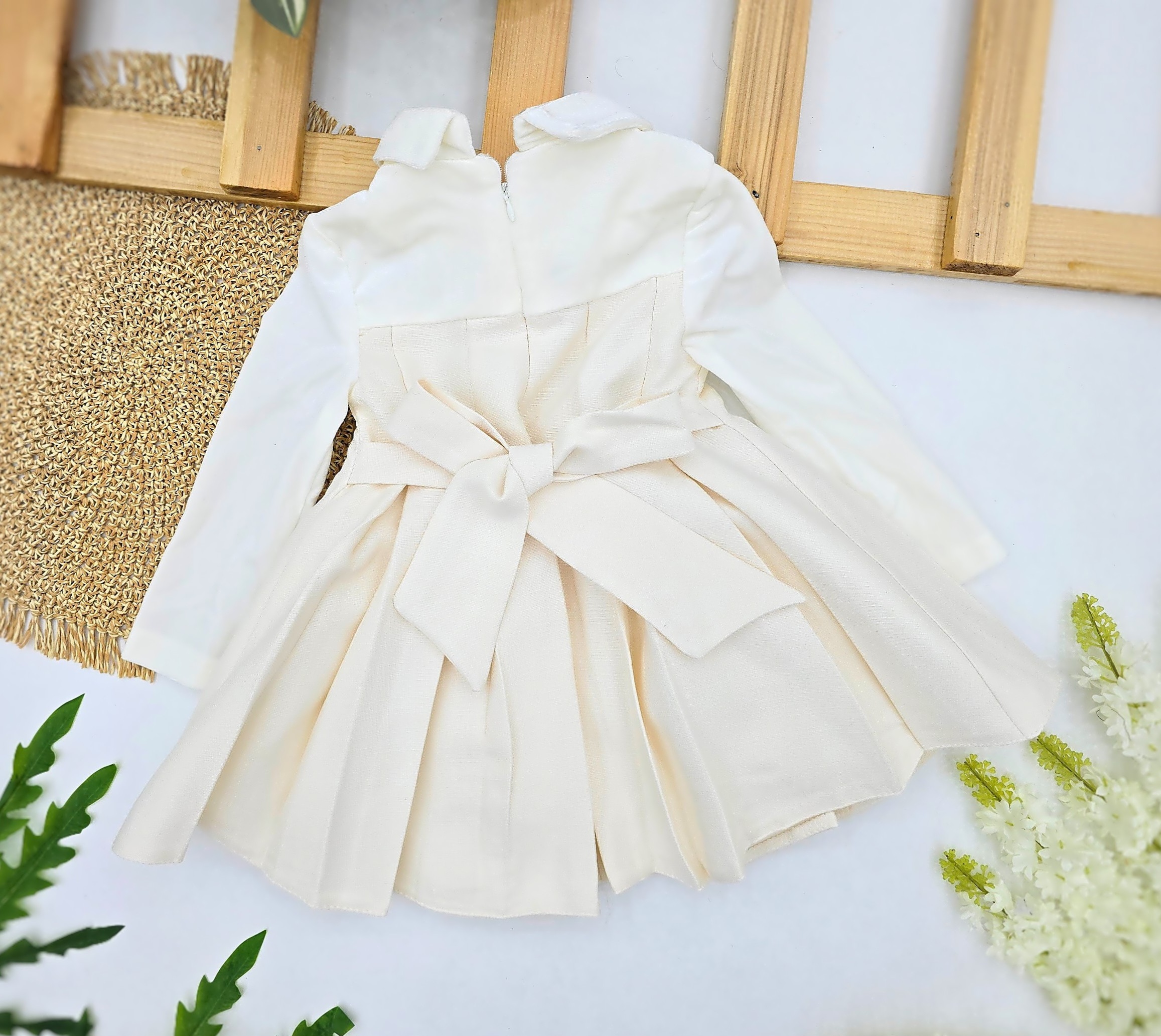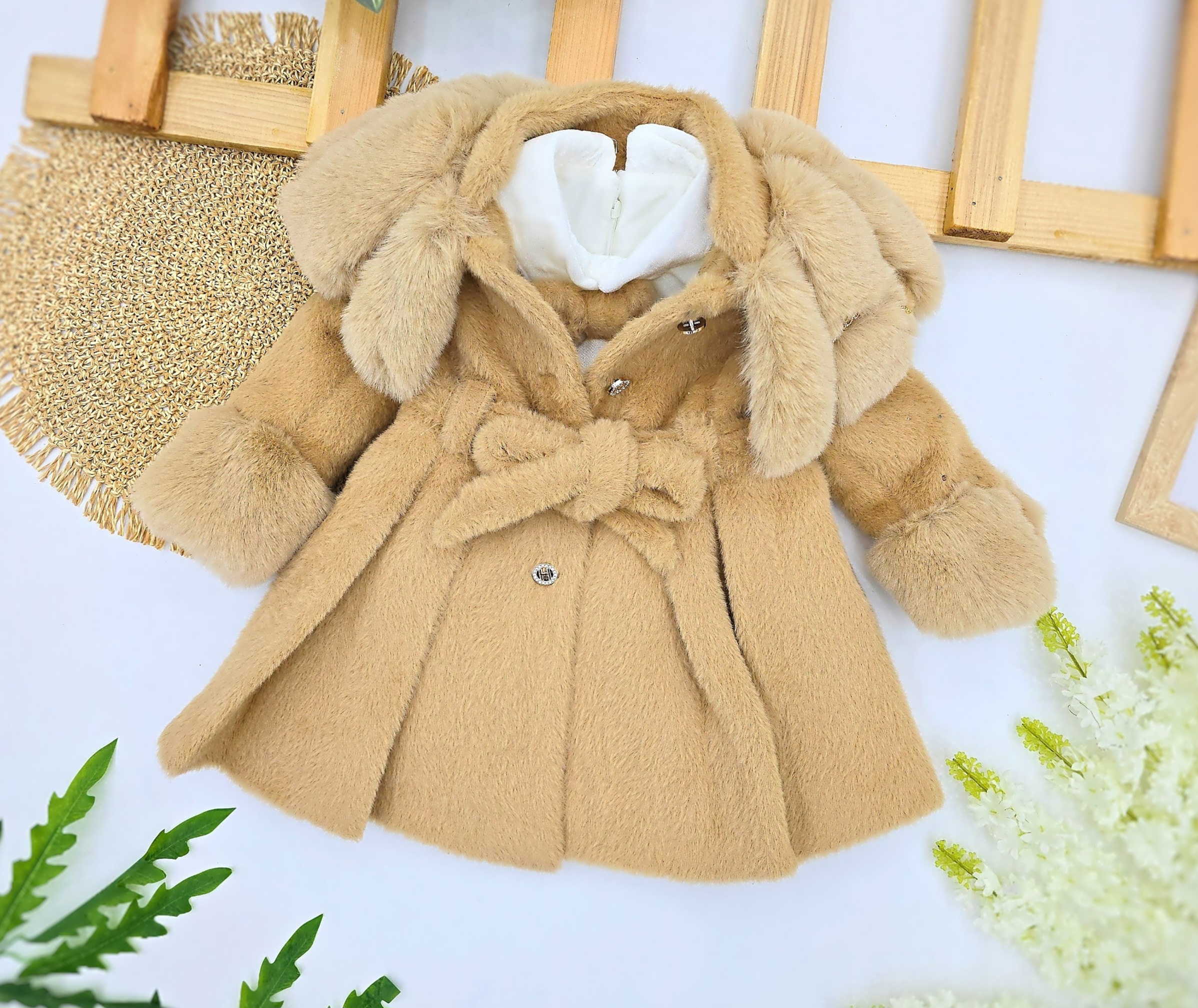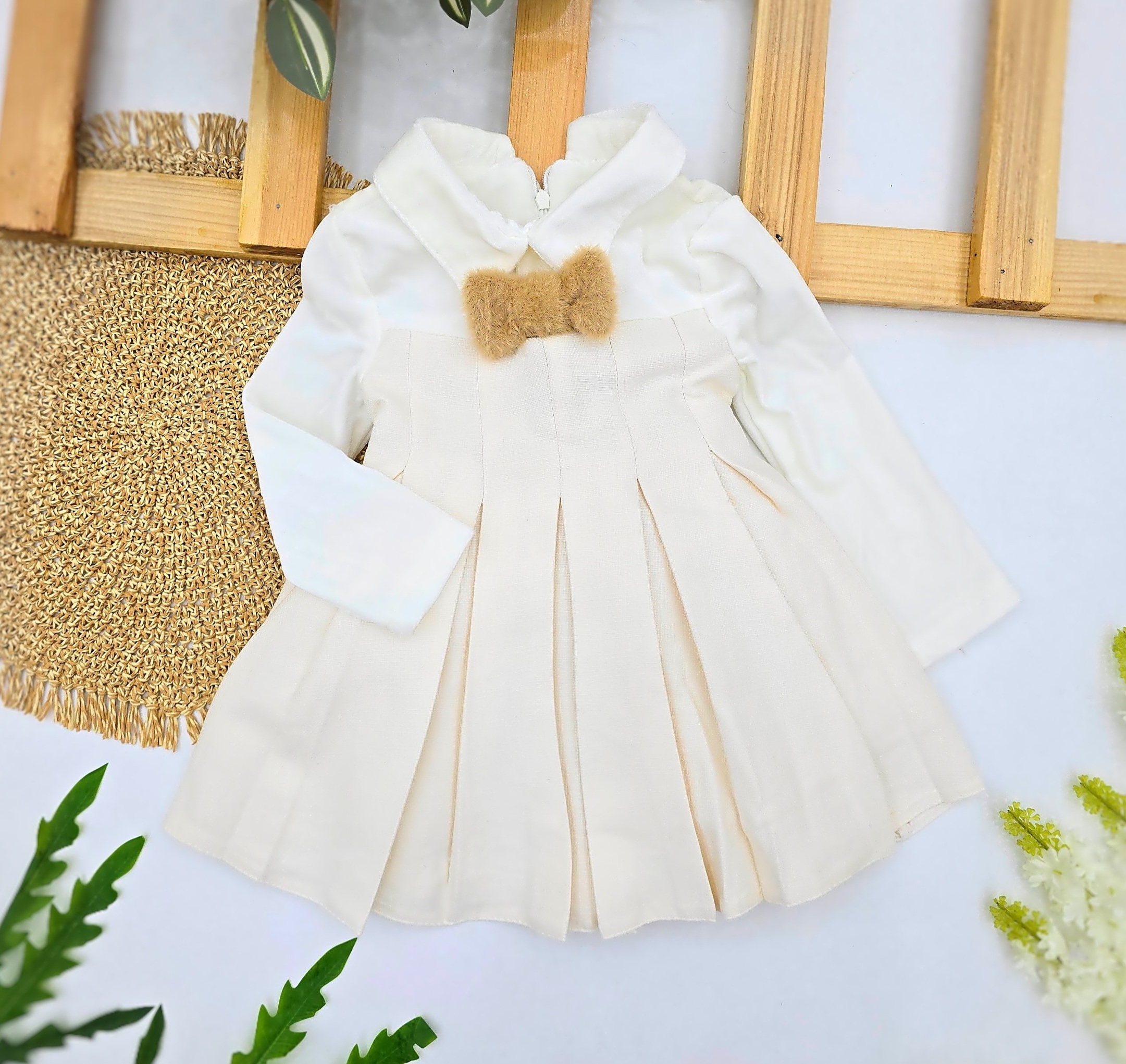 Prelepi dvodelni svečani komplet za male dame: luksuzni braon kaput sa bogatim krznenim detaljima i nežna svetlo krem haljinica. Kaput je topao, mekan i raskošno dizajniran sa krznom oko kragne i rukava, dok haljinica ima elegantnu mašnicu i savršeni kroj za svečane prilike.