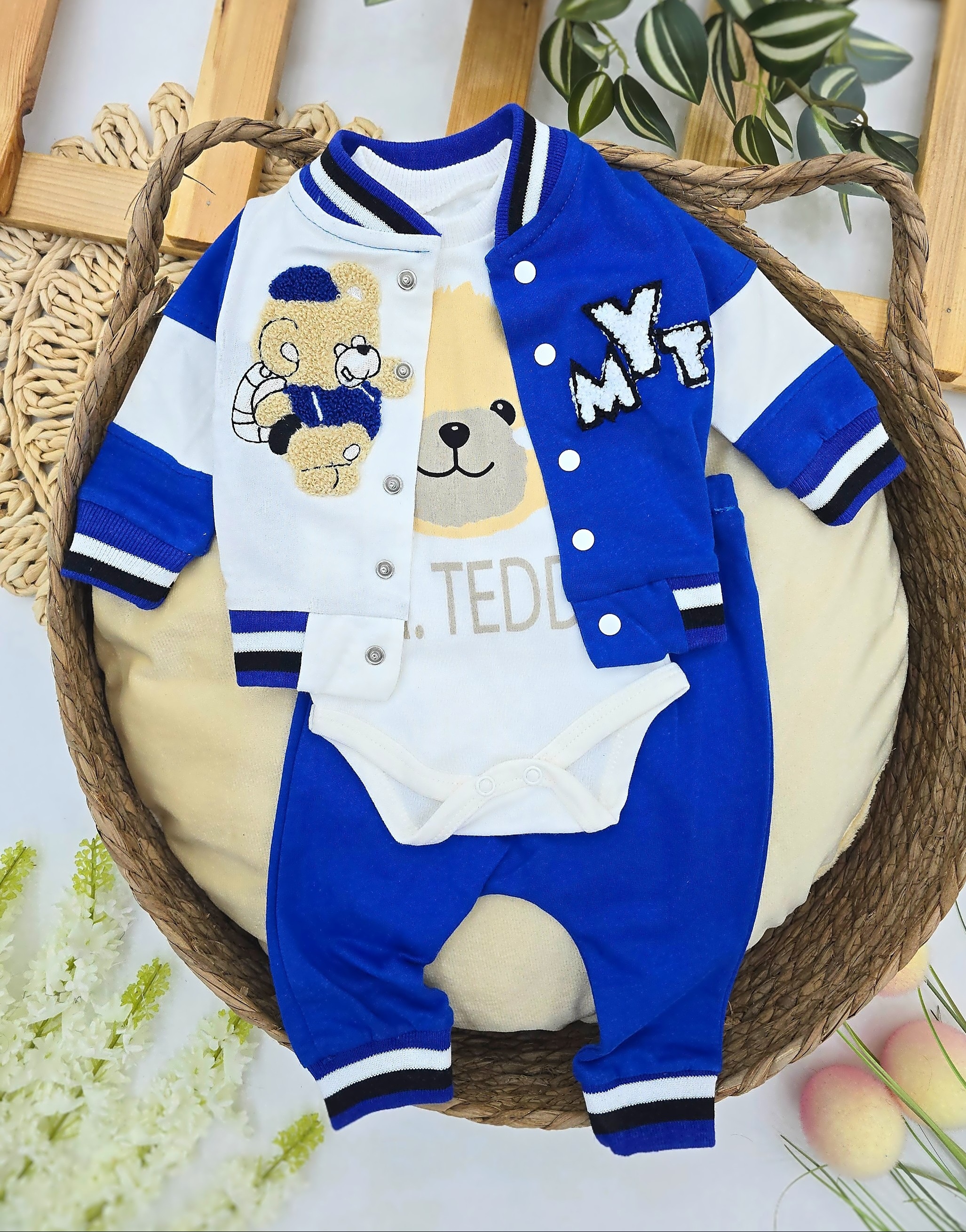 Moderan i udoban plavi set od 100 % pamuka za bebe dečake sa preslatkim motivom medvedića. Komplet sadrži mekani bodi sa medom, koledž duksić sa detaljima u sportskom stilu i udobne pantalone koje omogućavaju potpunu slobodu pokreta. Savršen za svaki dan, šetnju, fotografisanje ili kao poklon za posebnu priliku.