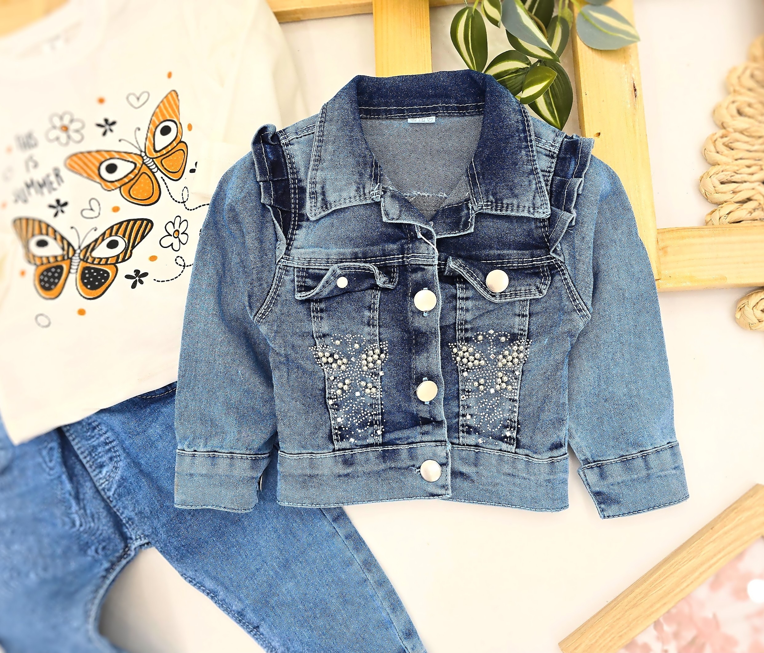 Predivan trodelni komplet za devojčice koji kombinuje udobnost i moderan stil. U setu dobijate belu bluzu dugih rukava sa simpatičnim printom leptira, teksas jaknicu ukrašenu detaljima sa cirkonima i farmerke koje su udobne i praktične za svakodnevno nošenje. Jakna i farmerke izrađene su od mekanog i kvalitetnog teksasa koji omogućava slobodu pokreta, dok bluza unosi vedrinu i šarm u ceo outfit. Savršen izbor za šetnje, proslave ili svakodnevne kombinacije koje su i udobne i trendi. Materijal: pamuk