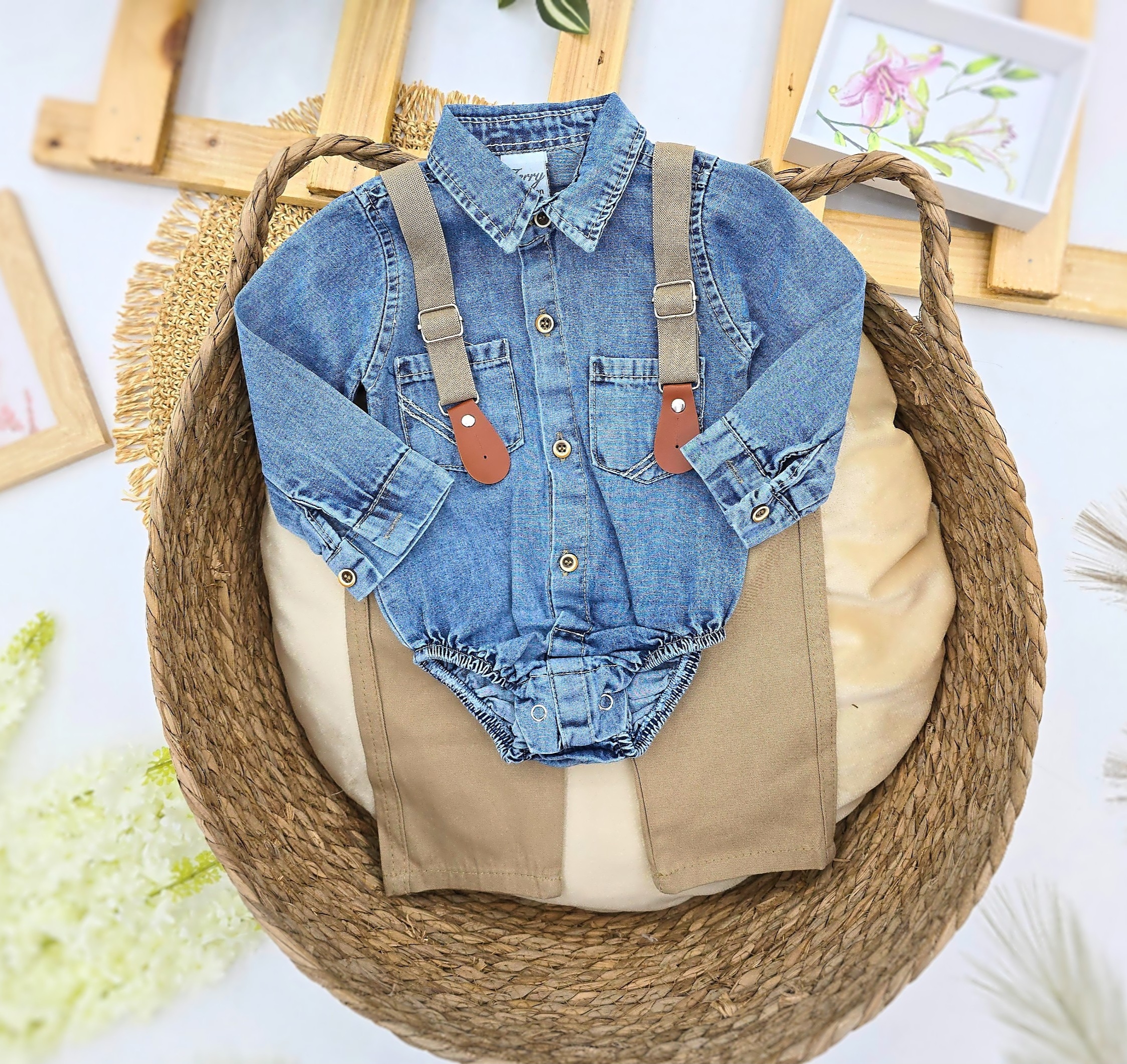 Komplet za bebe dečake – teksas bodi košulja sa tregerima i pantalone