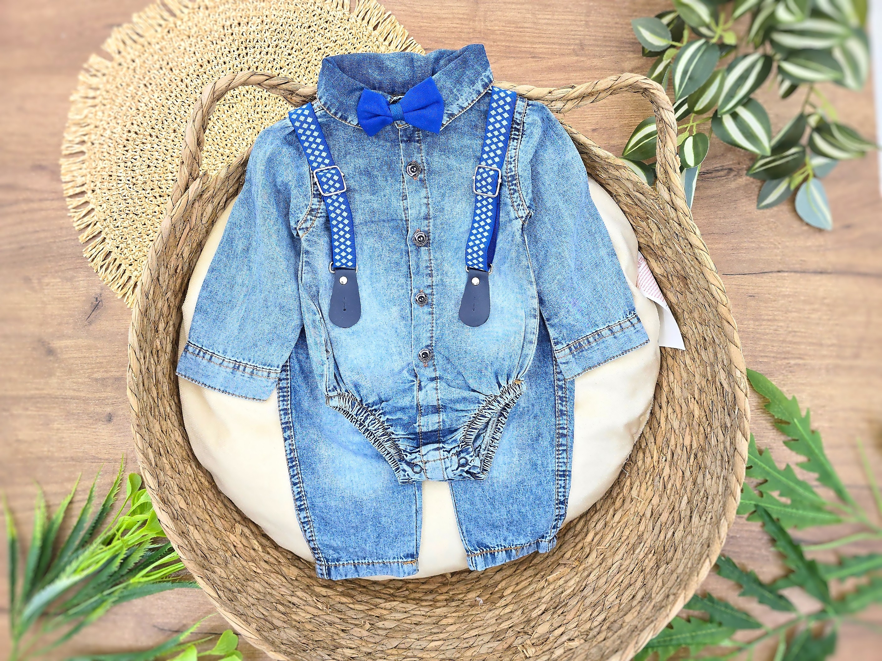 Informacije o proizvodu "Komplet za bebe dečake – teksas plava bodi košulja sa leptir mašnom, tregerima i farmericama"