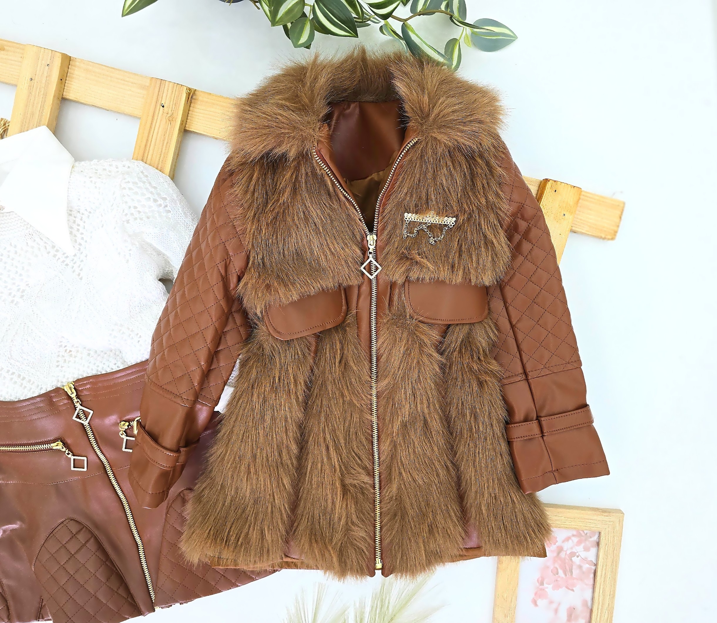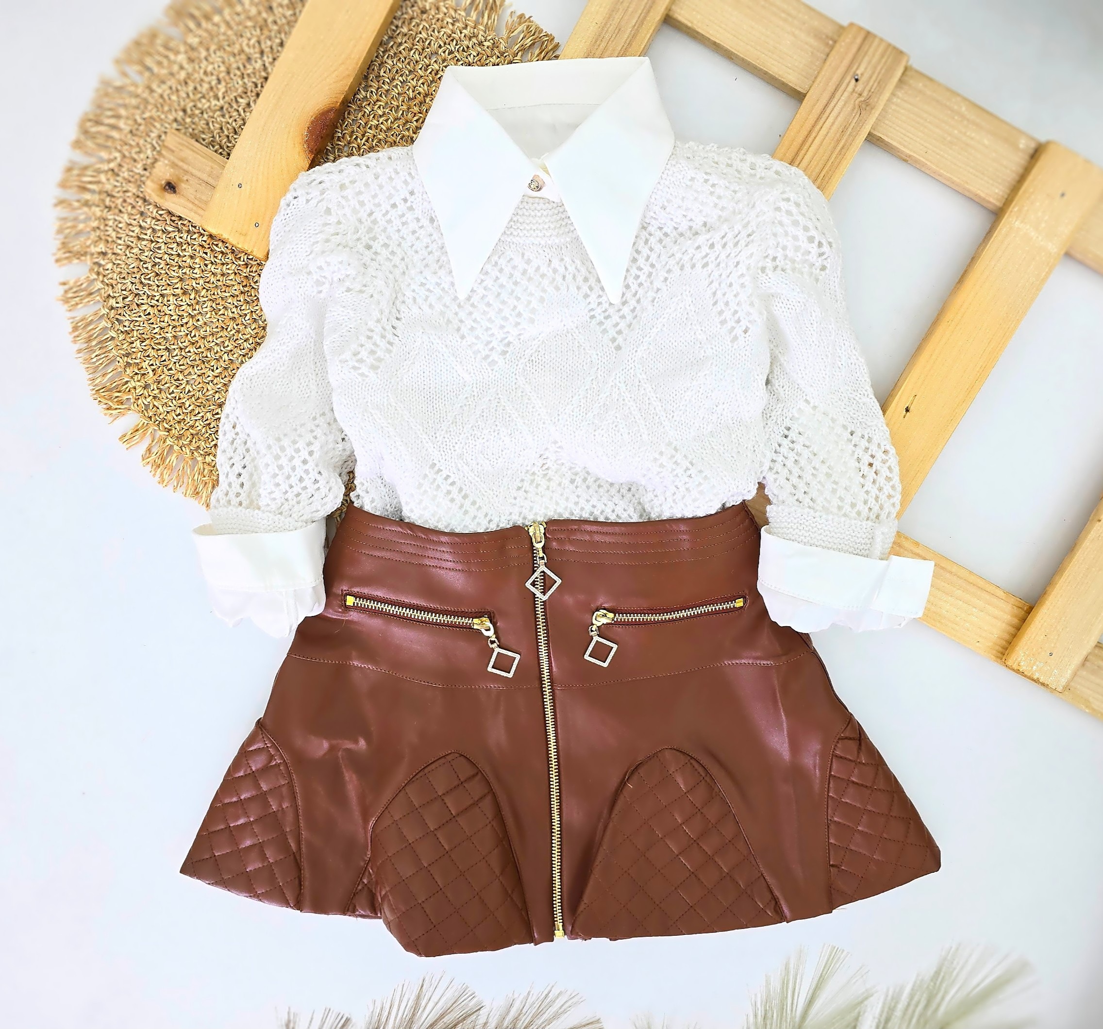 Predivan komplet za devojčice koji spaja eleganciju i toplinu! Set uključuje belu košulju sa modernim detaljima, braon suknju sa rajsferšlusima, bundicu sa krznom i udoban džemper. Idealna kombinacija za jesen i zimu, savršena za sve prilike – od šetnje do svečanih trenutaka.