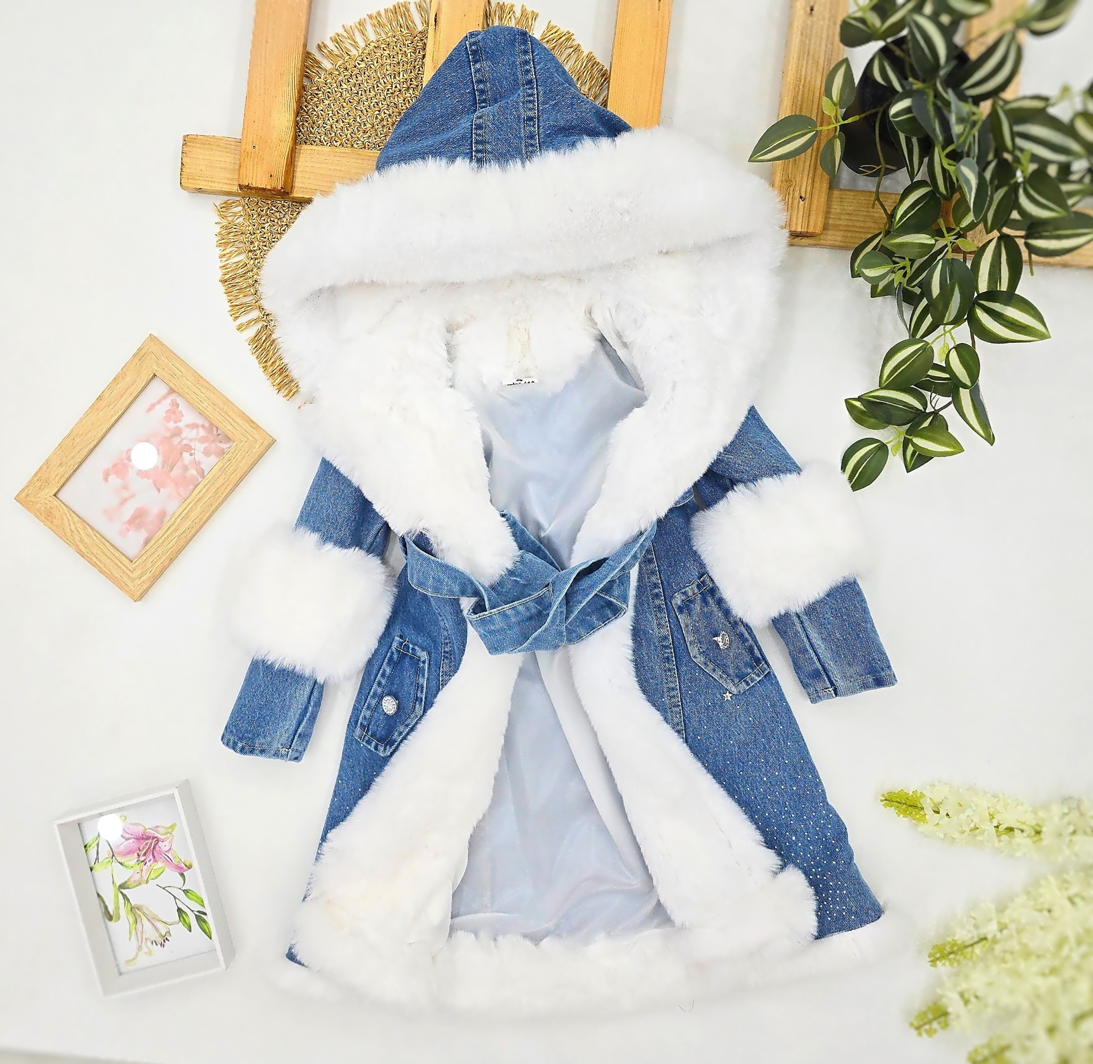 Informacije o proizvodu "Komplet za devojčice – teksas kaput sa krznom i svečana velur haljinica"
