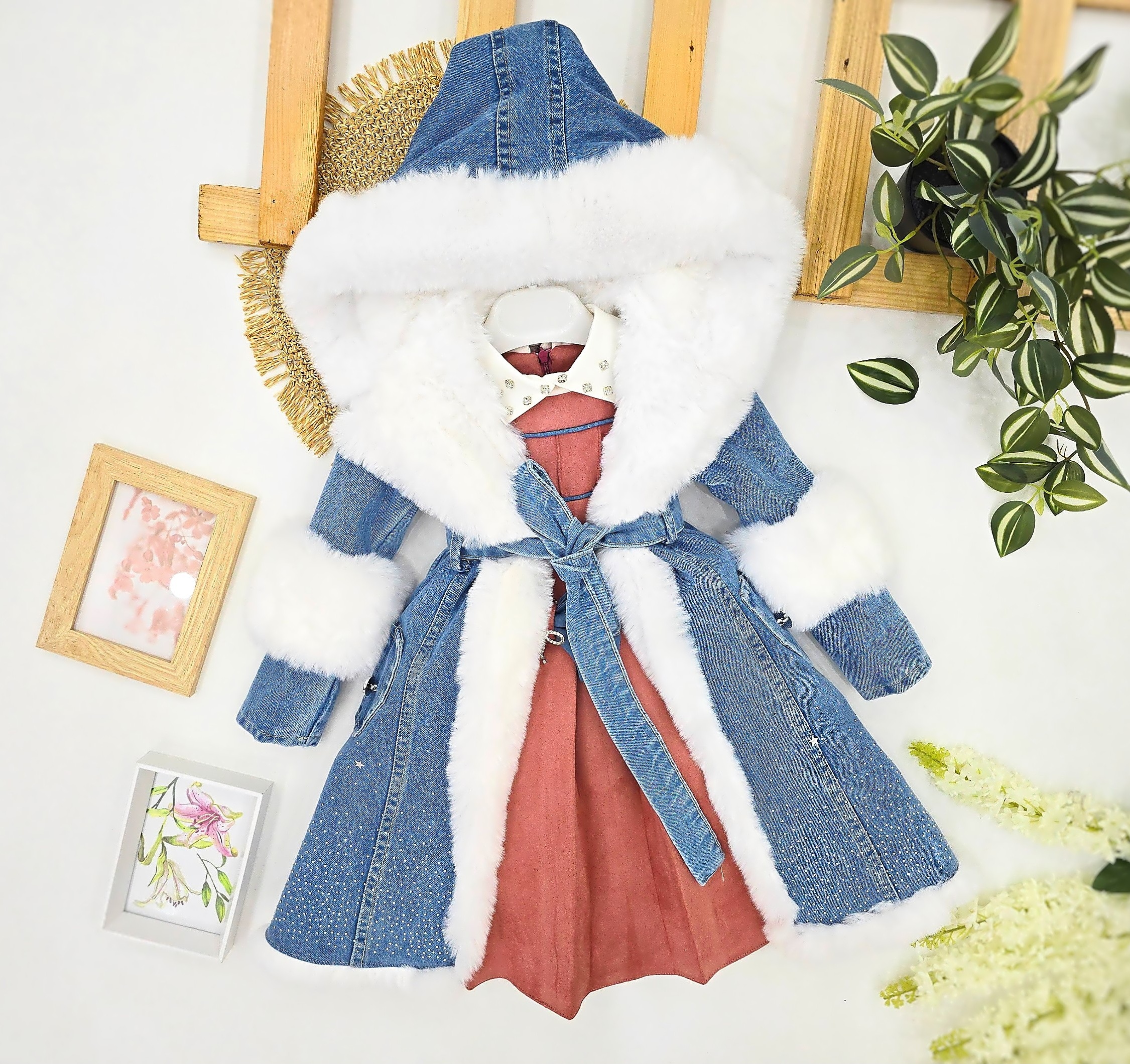 Komplet za devojčice – teksas kaput sa krznom i svečana velur haljinica