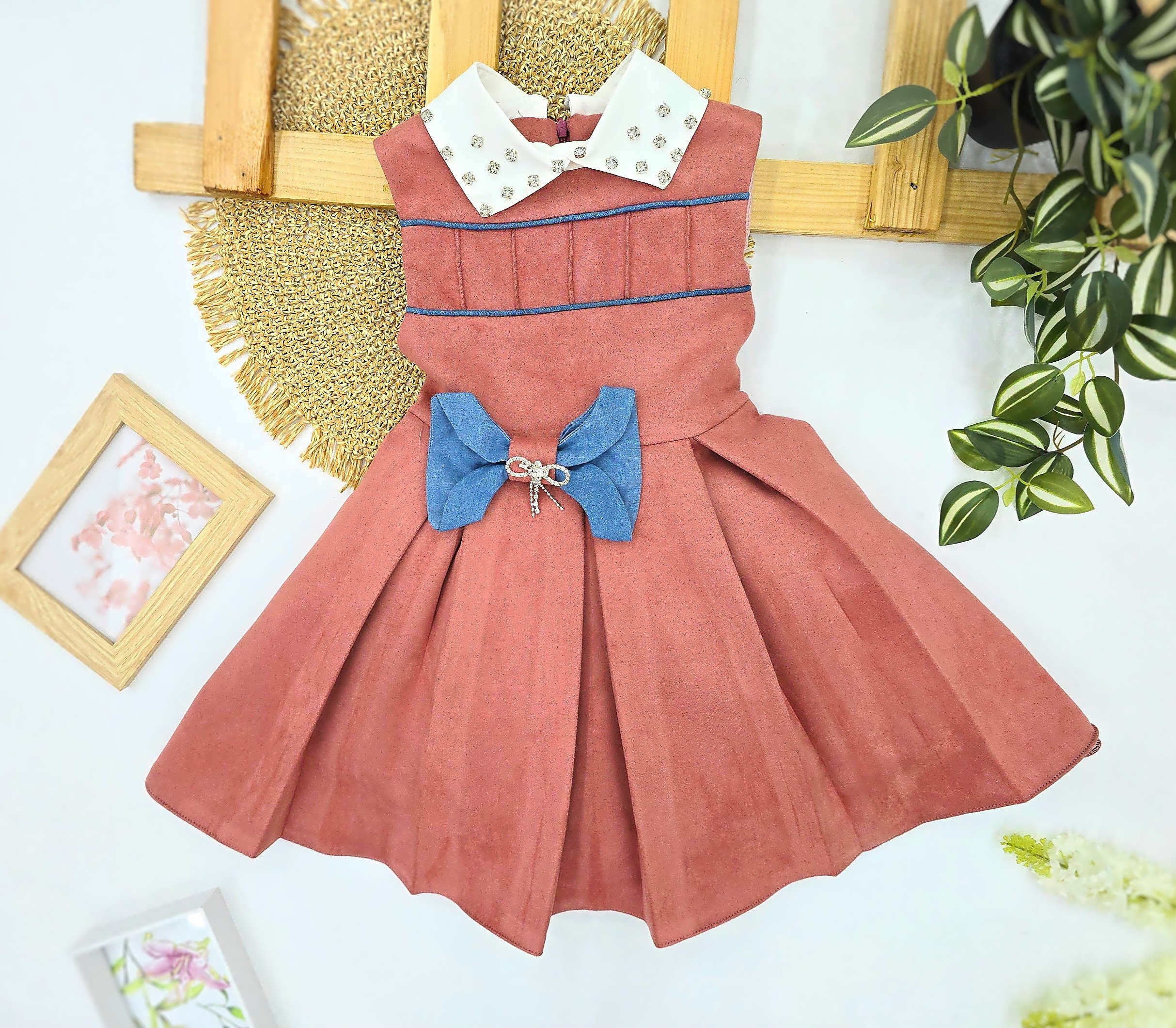 Prelep luksuzni komplet za male dame 💎✨ Sastoji se od teksas kaputa obloženog mekim belim krznom i elegantne velur haljinice u prljavo roze nijansi. Haljinica ima kragnu ukrašenu biserima i mašnicu od teksasa koja dodaje poseban šarm. Kaput je savršen za hladnije dane, dok haljinica unosi dozu svečanosti – idealno za rođendane, praznike i posebne prilike.