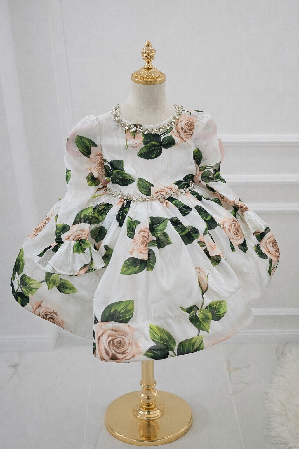Elegantna i romantična haljina za devojčice u nežnoj beloj boji sa printom ruža i bogatom suknjom punog volumena. Model je ukrašen dekorativnim kristalnim detaljima oko vrata i struka, dok zadnju stranu krasi velika puder roze mašna koja daje poseban, svečani efekat. Haljina je idealan izbor za rođendane, venčanja, krštenja i sve posebne prilike kada želite da vaša devojčica izgleda nežno, luksuzno i drugačije.
