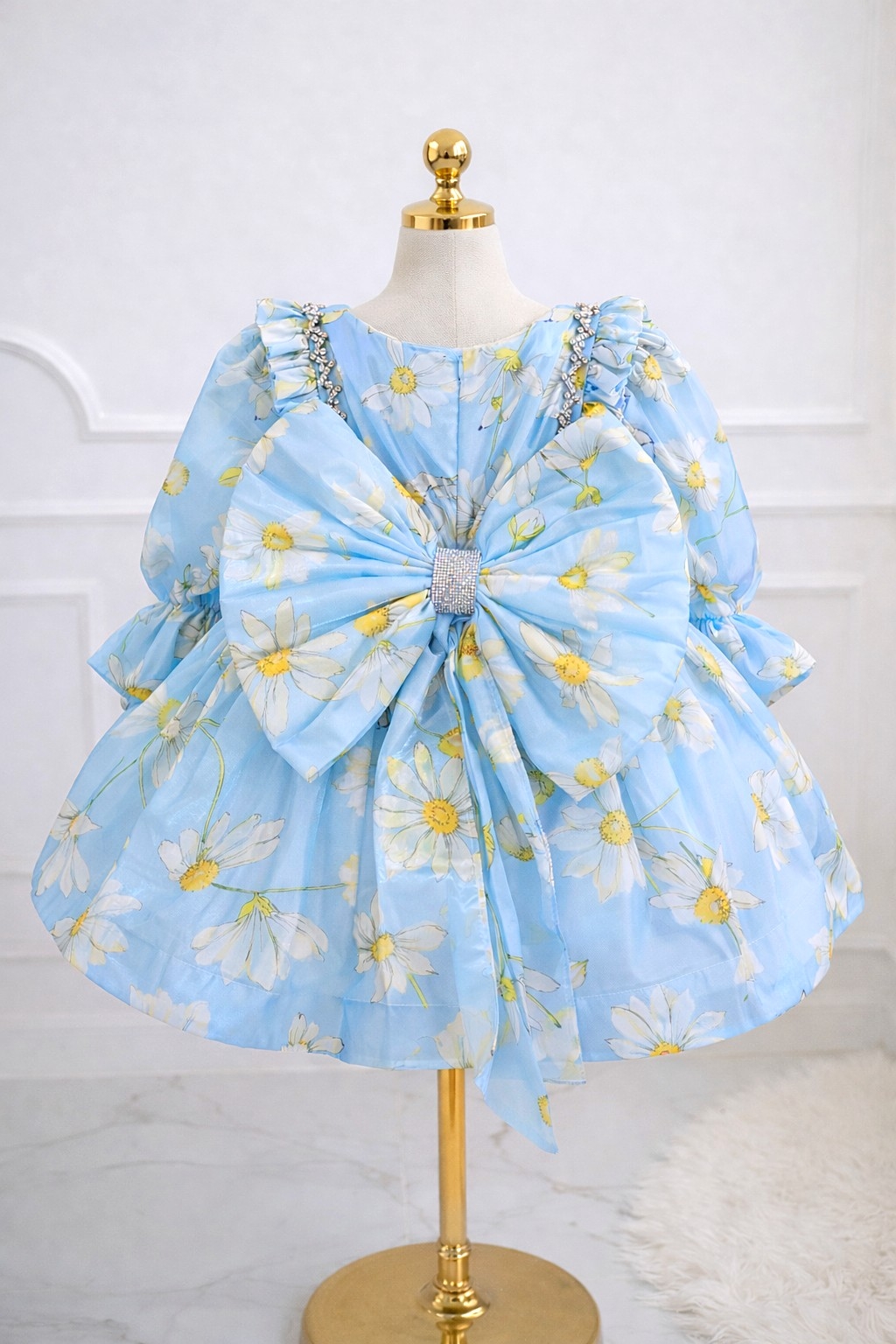 Elegantna i raskošna haljina za devojčice u nežnoj plavoj nijansi sa prelepim printom belih rada. Model je bogato krojen sa punim, lepršavim obimom suknje koji daje princeza efekat pri svakom pokretu. Ramena su ukrašena dekorativnim detaljima sa diskretnim sjajem, dok velika mašna pozadi dodatno naglašava luksuzan izgled. Savršen izbor za rođendane, proslave, krštenja i sve posebne prilike kada želite da vaša devojčica zablista. ✨