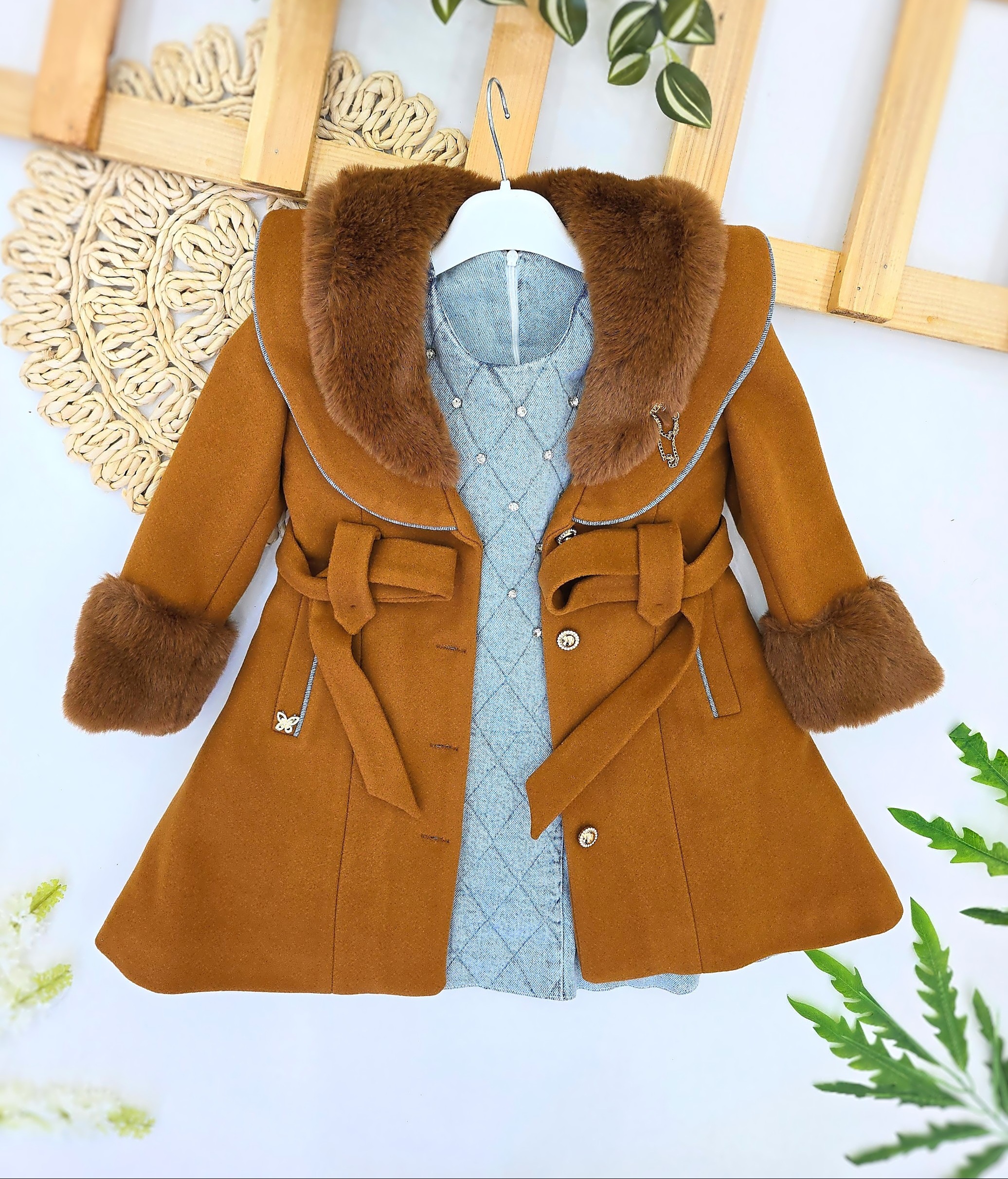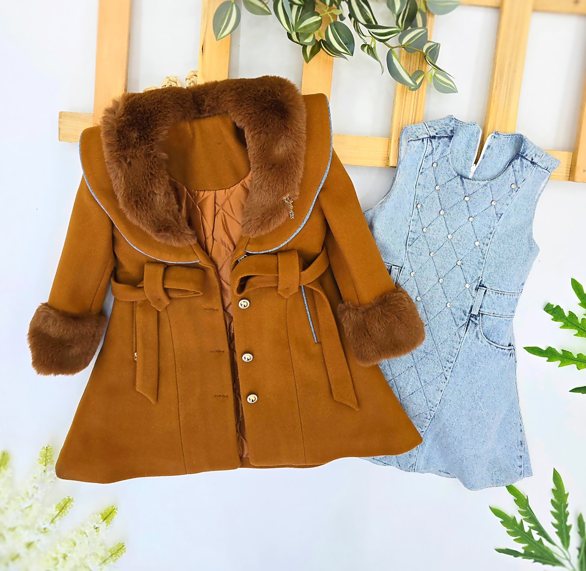 Predivan lux komplet za devojčice koji kombinuje eleganciju i stil. Sadrži kaput u toploj karamela nijansi sa bogatom krznenom kragnom i manžetnama, ukrašen detaljima poput mašne i broša „Angel“, uz teksas haljinicu koja se savršeno uklapa ispod. Savršen izbor za zimu, praznične prilike i posebne događaje.