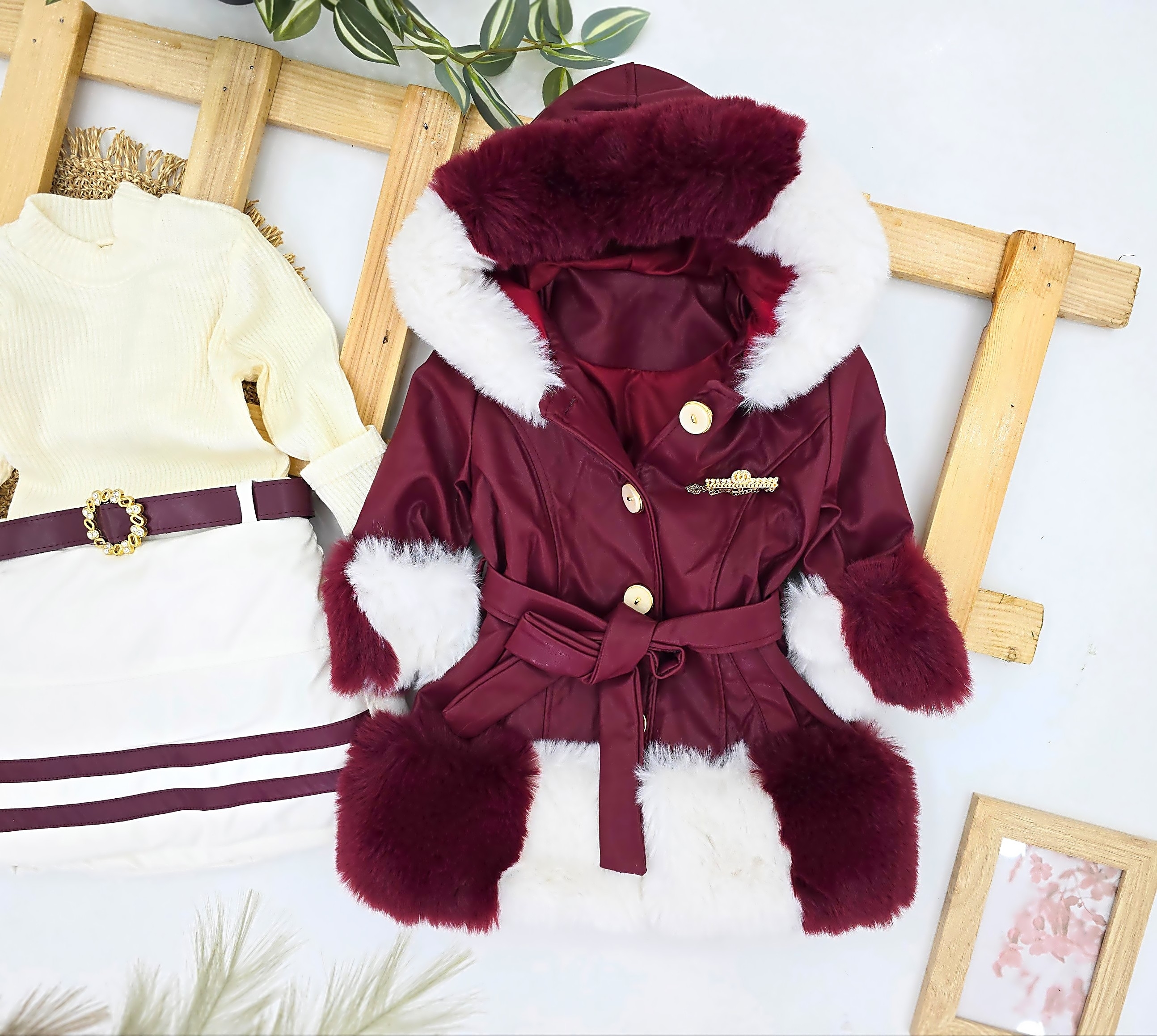 Ekskluzivan lux komplet za prave male dame! Sadrži elegantan kaput sa krznom, modernu suknju sa kaišem i bluzicu. Savršen izbor za posebne prilike, svečanosti i zimske dane kada želite da vaše dete izgleda otmeno, moderno i toplo u isto vreme.