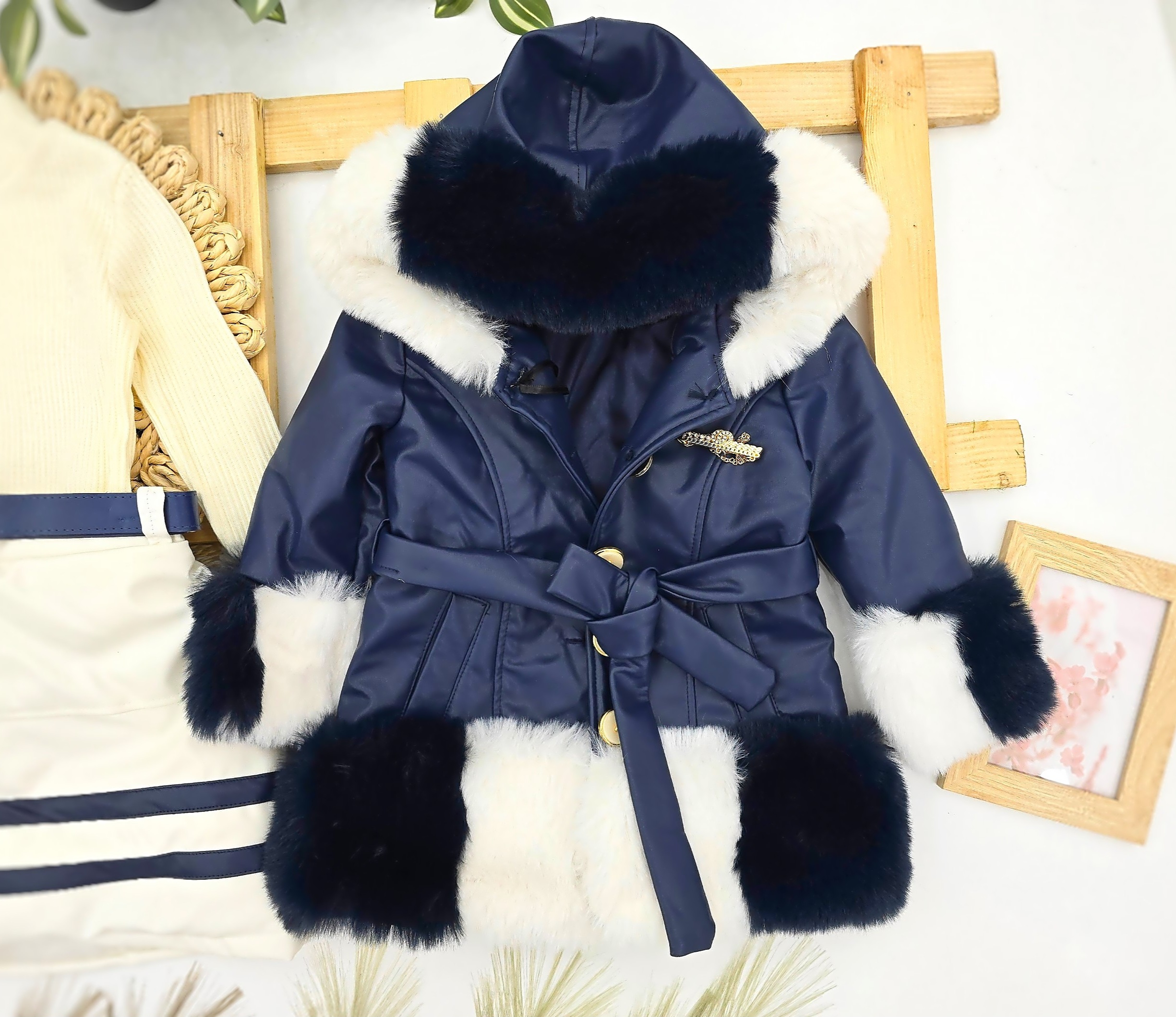 Prelep lux komplet za devojčice koji donosi kombinaciju elegancije i topline. Set uključuje kaput u tamnoplavoj boji sa detaljima od krzna, modernu belu suknjicu sa tamnoplavim prugama, bluzu od prijatnog materijala i elegantan kaiš koji upotpunjuje ceo outfit. Savršen izbor za svečane prilike, posebne događaje ili kao modni detalj tokom hladnijih dana. Uz ovaj komplet, svaka devojčica će izgledati jedinstveno.