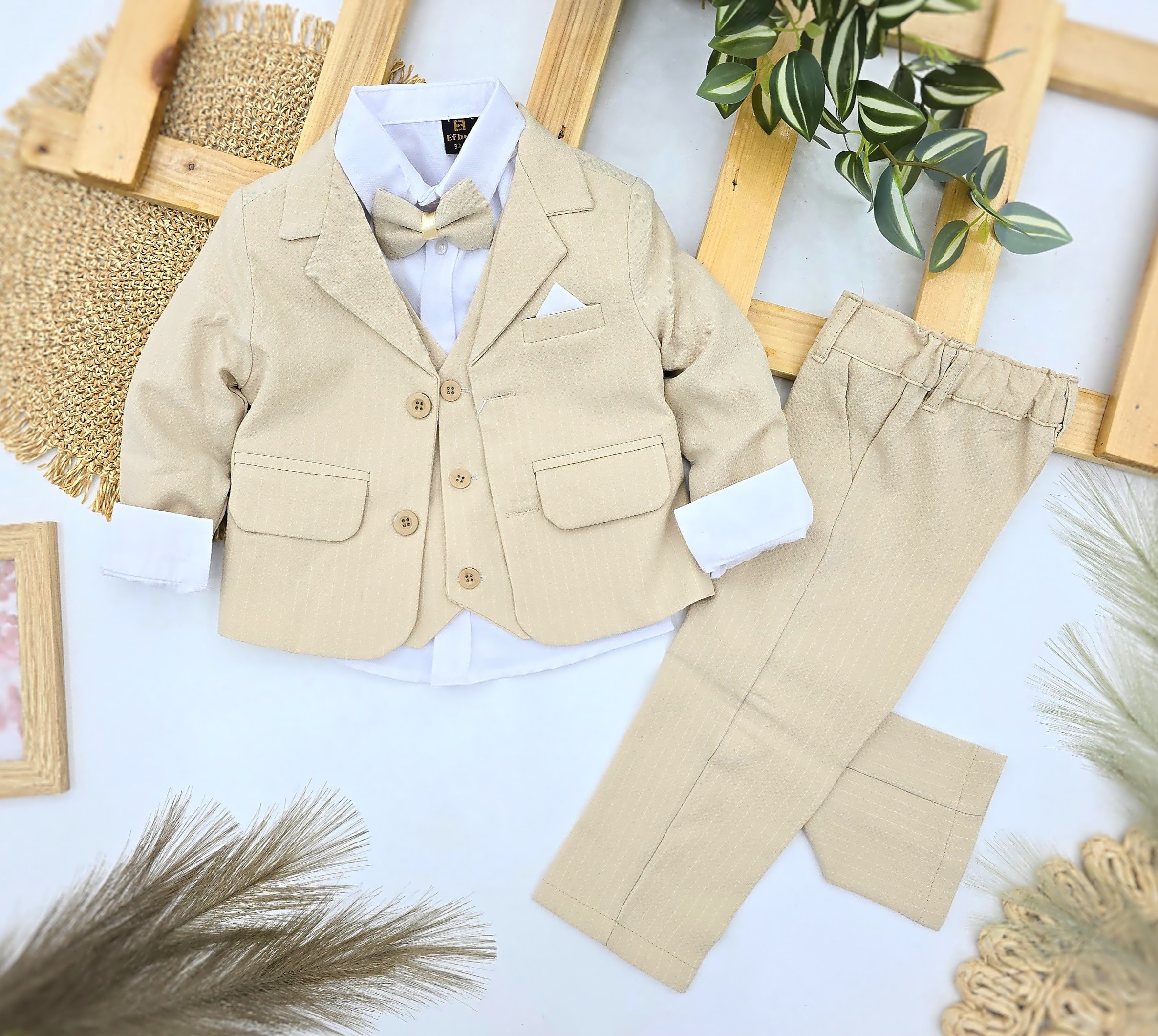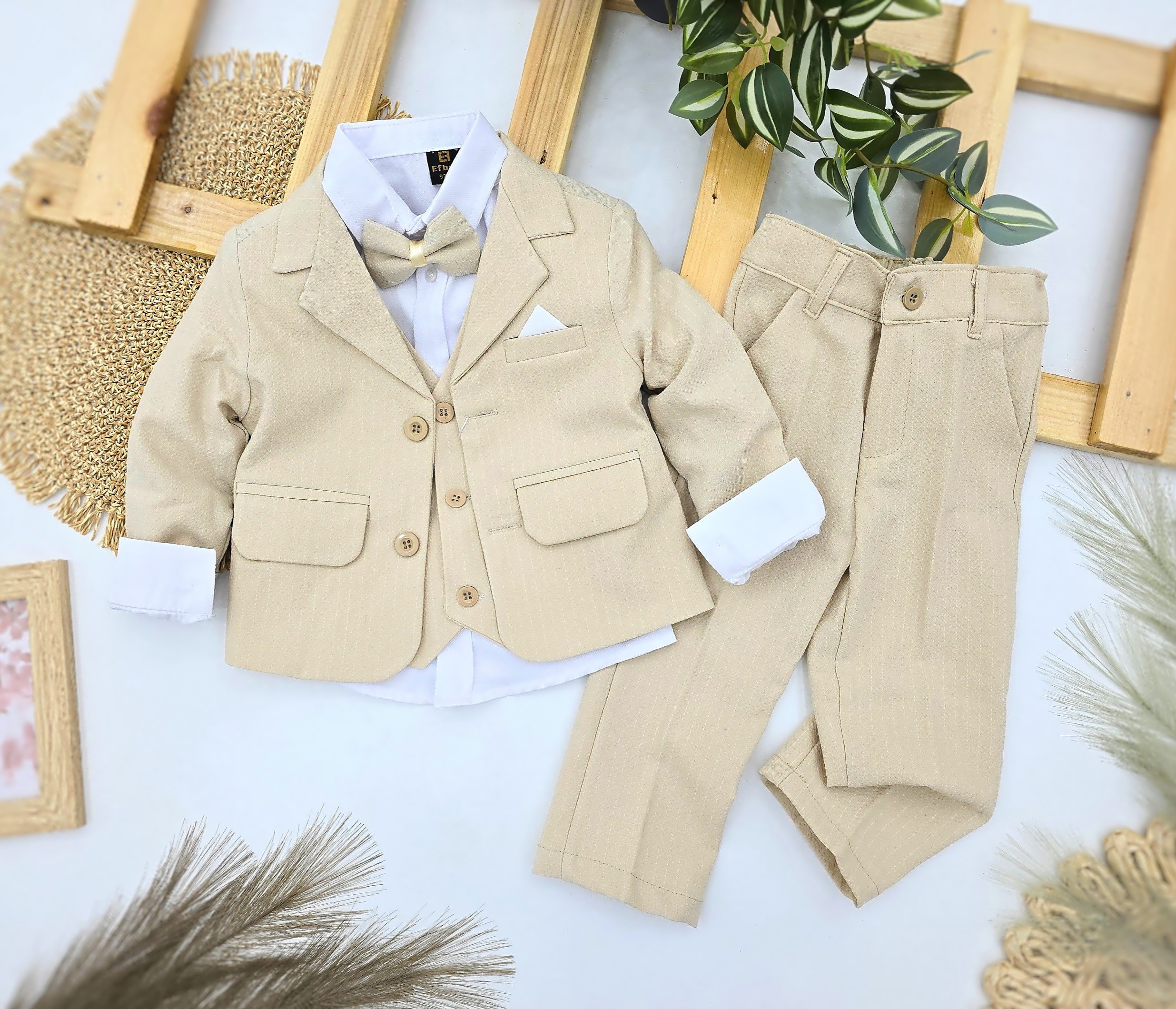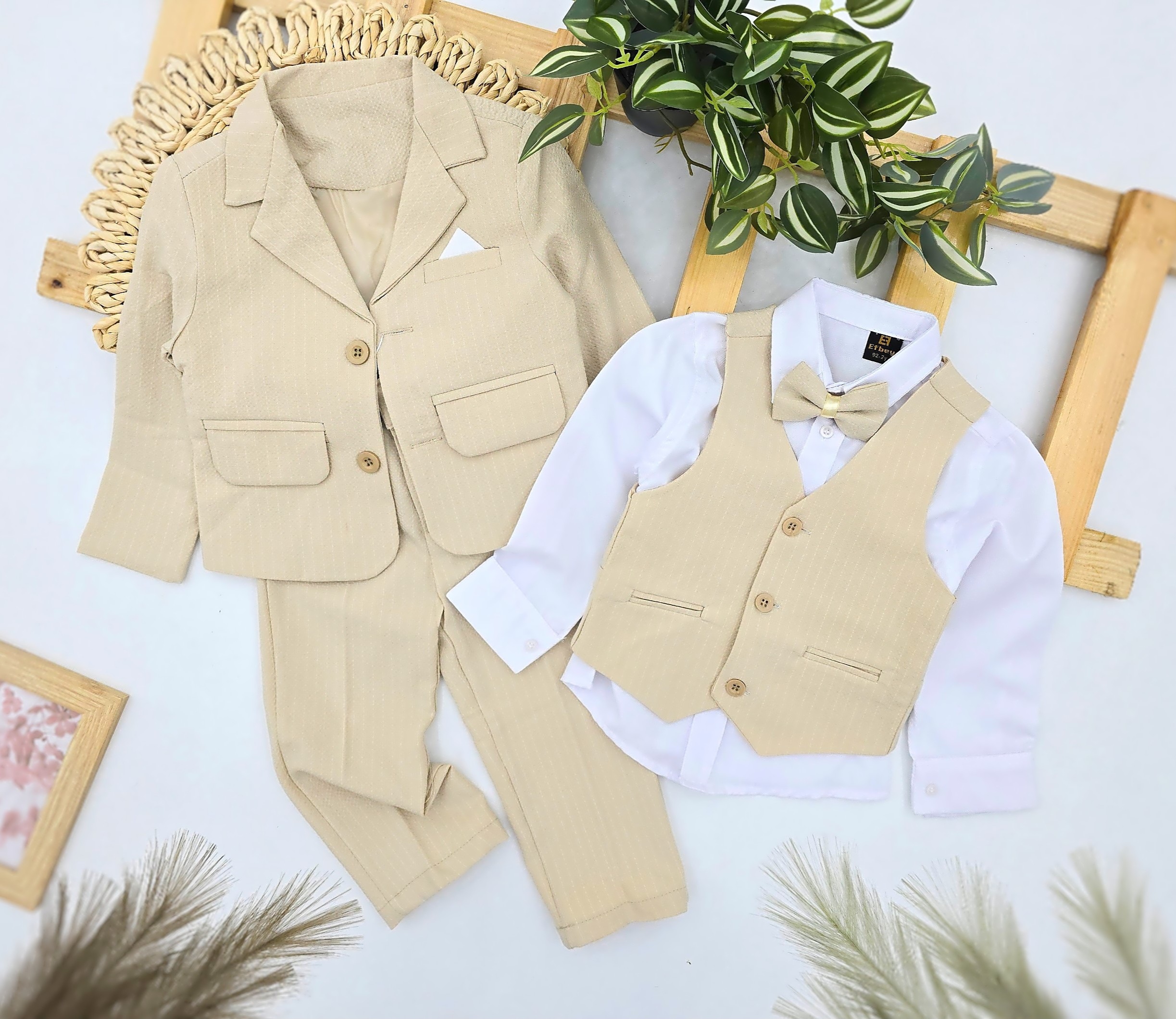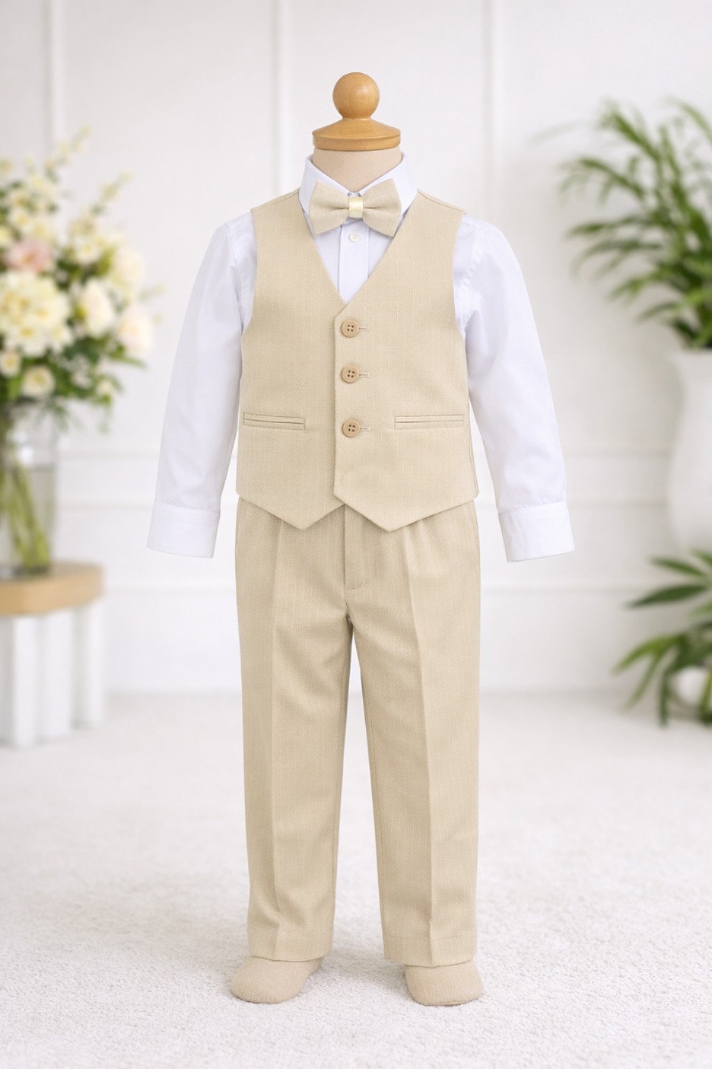 Ekskluzivno svečano odelo za dečake u elegantnoj bež nijansi. Set sadrži moderan sako sa dugmićima, belu košulju dugih rukava, prsluk sa dugmićima, leptir mašnu i pantalone. Idealno za svečane prilike – venčanja, rođendane, krštenja ili proslave. Kombinacija udobnosti i stila čini ovo odelo savršenim izborom za male gospodičiće koji žele da izgledaju otmeno i šarmantno.