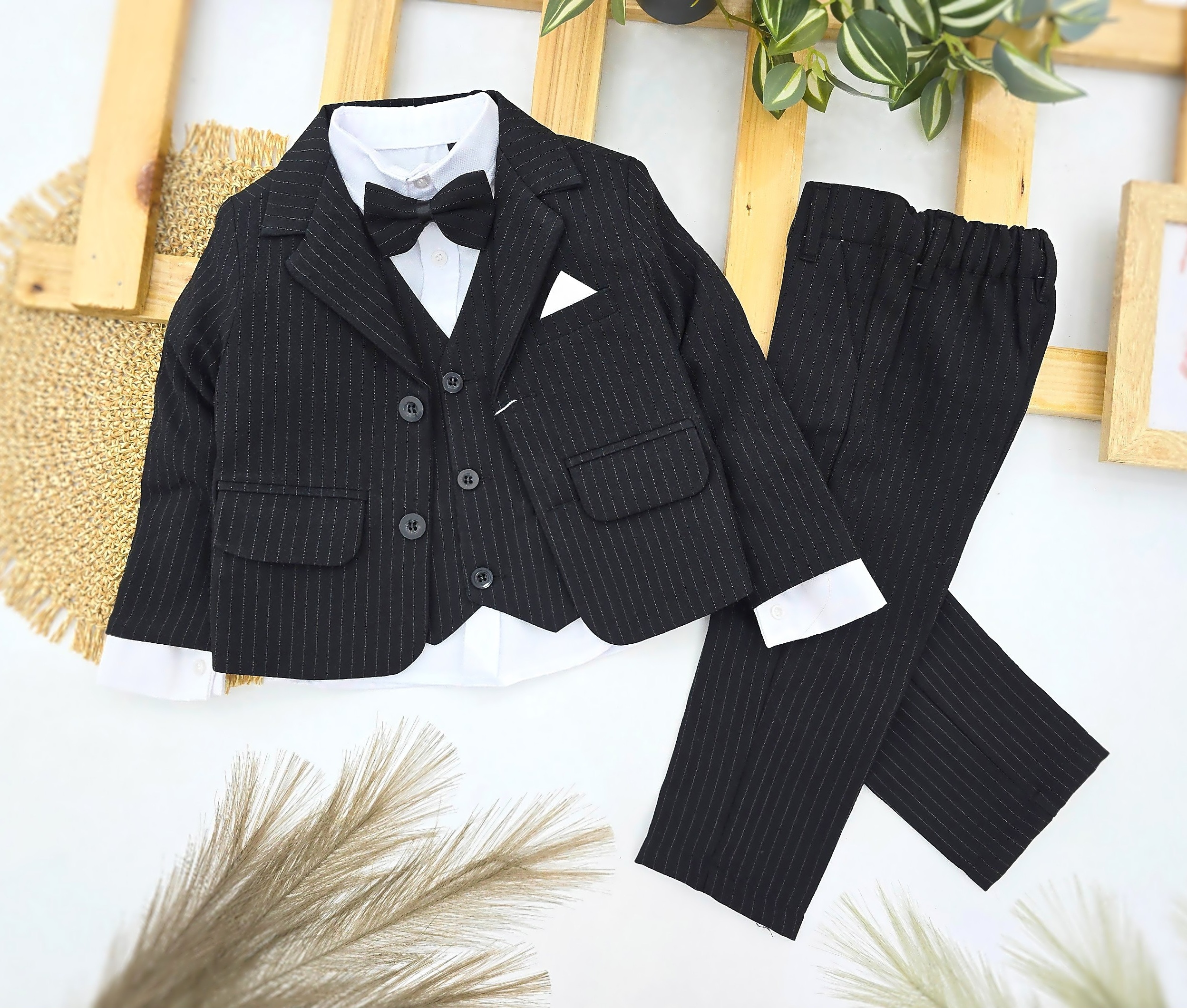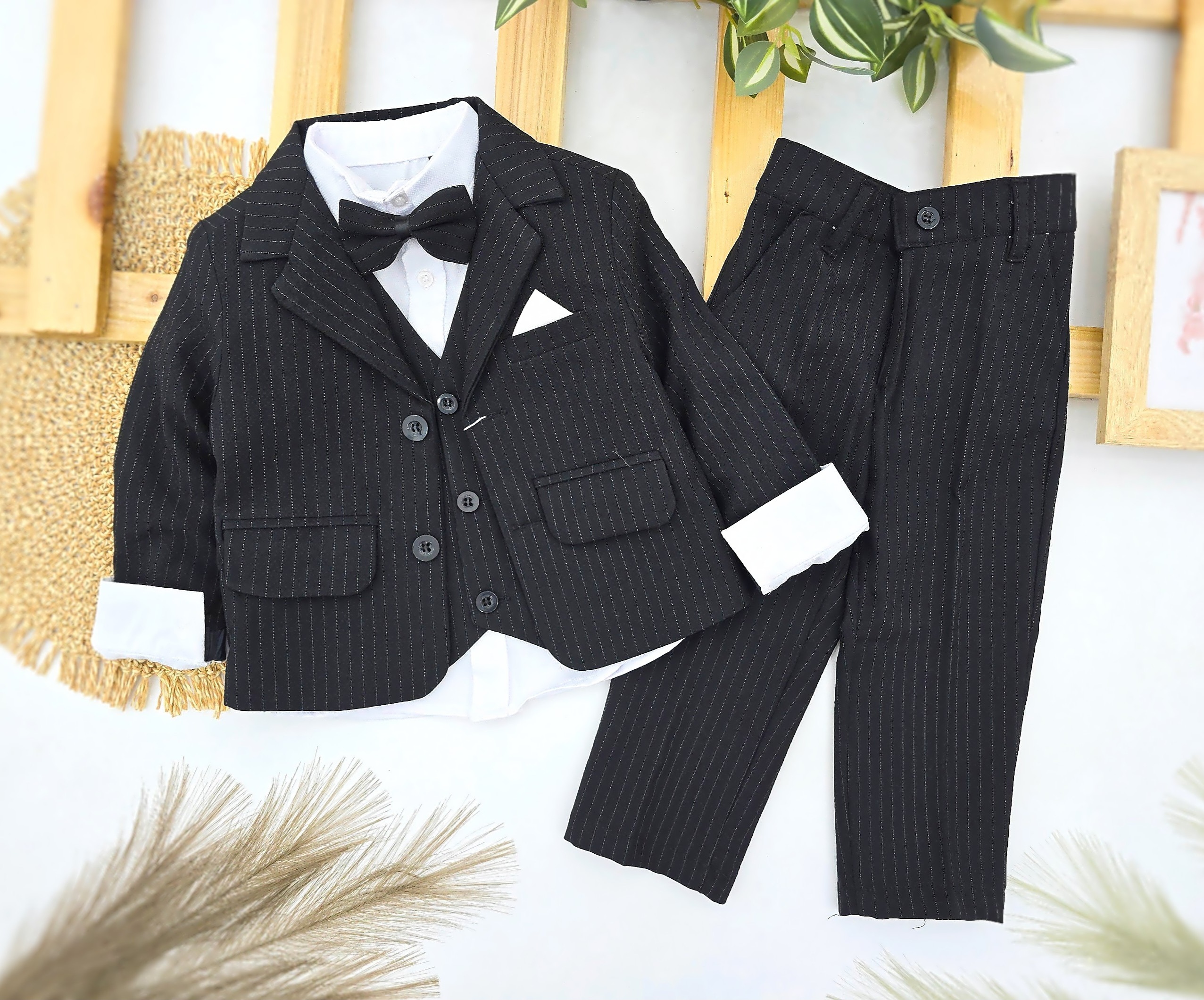 Elegantan komplet svečanog odela za dečake u crnoj boji sa sitnim prugama. Set uključuje moderan sako, belu košulju, prsluk, leptir mašnu i pantalone. Idealan izbor za svečane prilike – venčanja, rođendane, krštenja i proslave. Odelo je krojeno da pruži udobnost i otmen izgled, pa će vaš dečak izgledati kao pravi mali džentlmen.