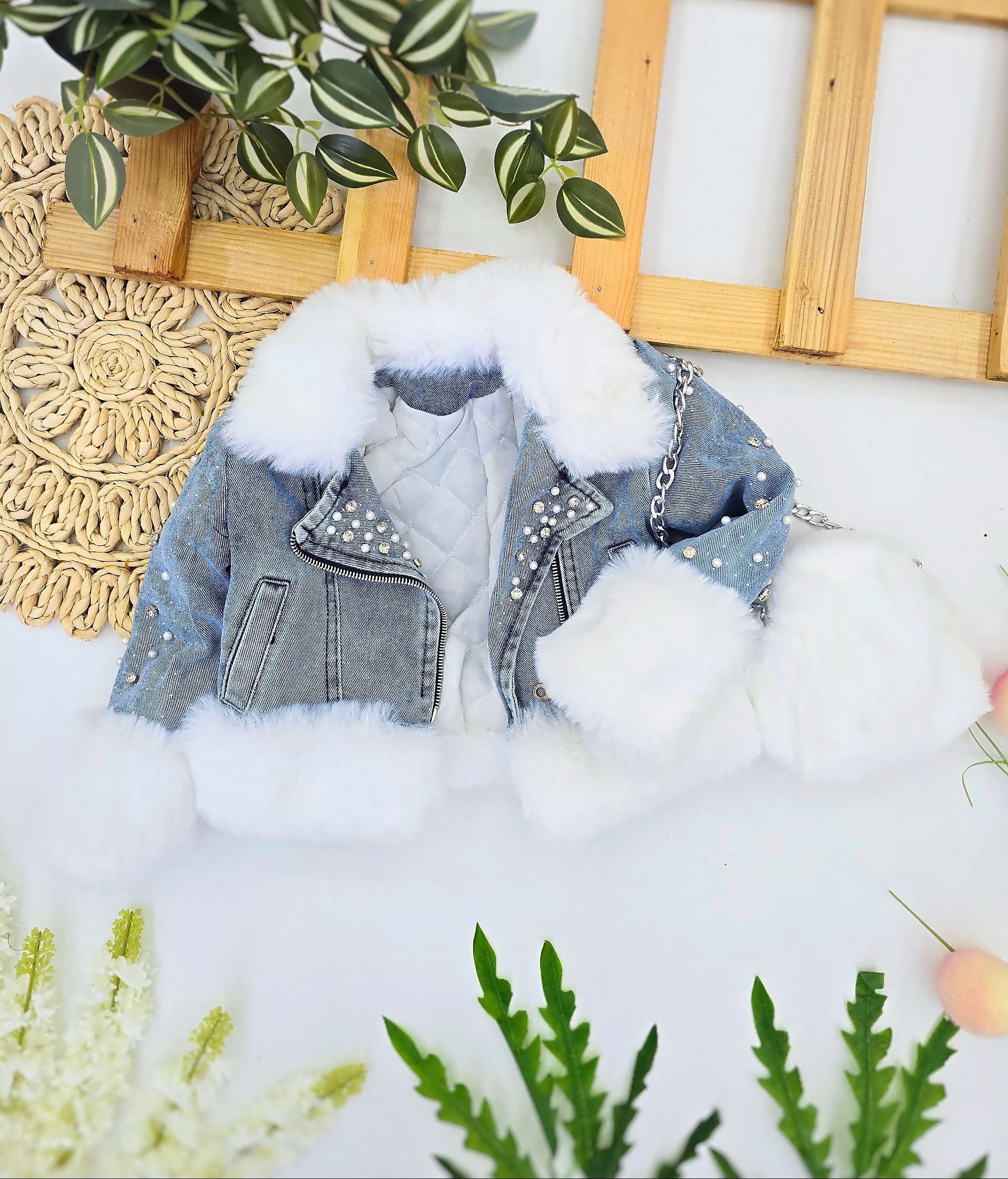 Luksuzni teksas komplet za devojčice sa elegantnim belim krznom koji uključuje bundicu, suknju, bluzu, torbicu i beretku. Pažljivo odabrani detalji poput perlica i mekanog krzna daju ovom setu poseban, sofisticiran izgled. Idealan je za svečane prilike, proslave i posebne trenutke, uz istovremenu udobnost i toplinu tokom hladnijih dana.