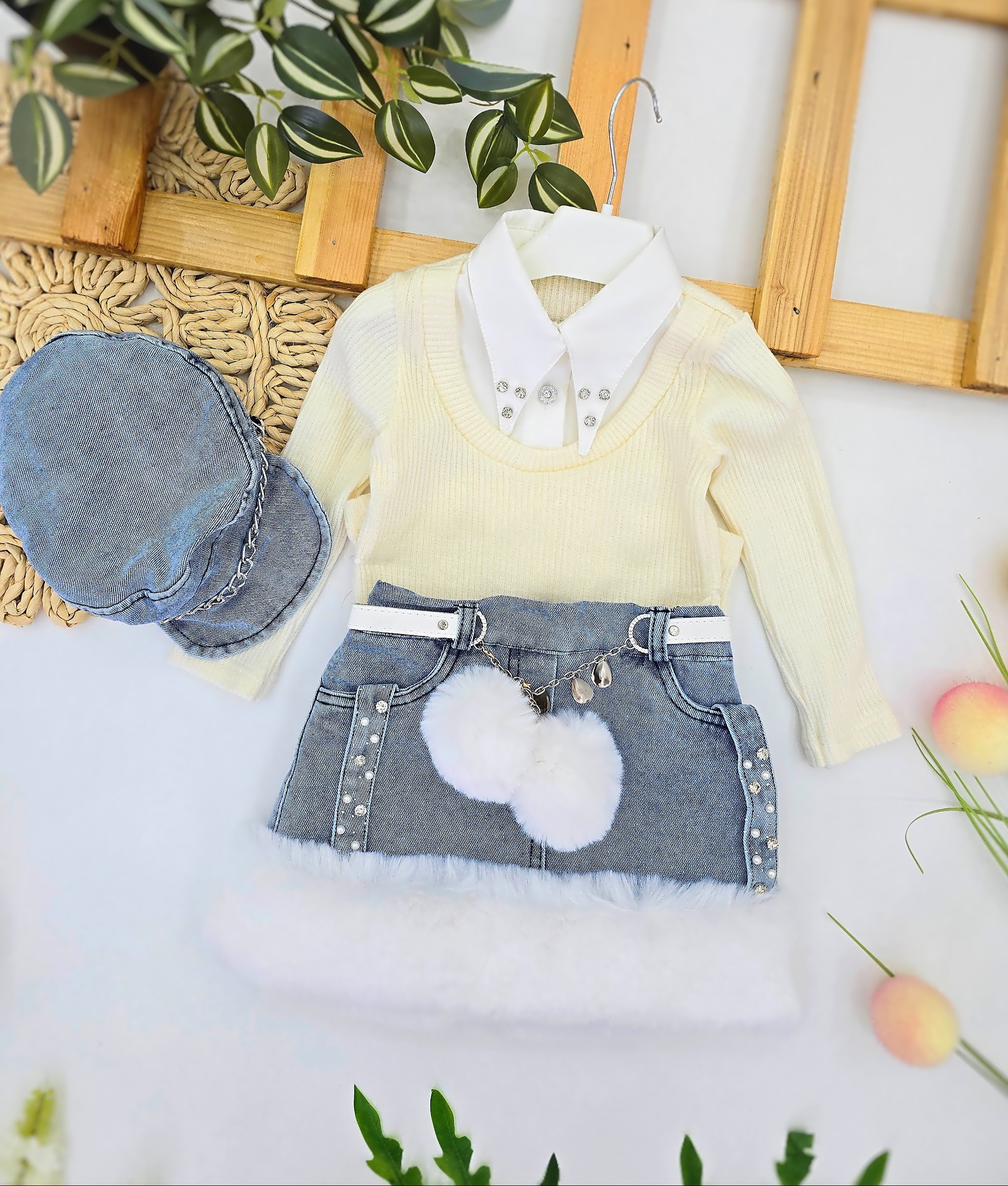Lux teksas komplet za devojčice sa belim krznom – bundica, suknja, bluza, torbica i beretka