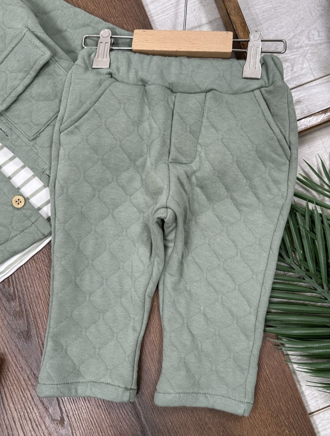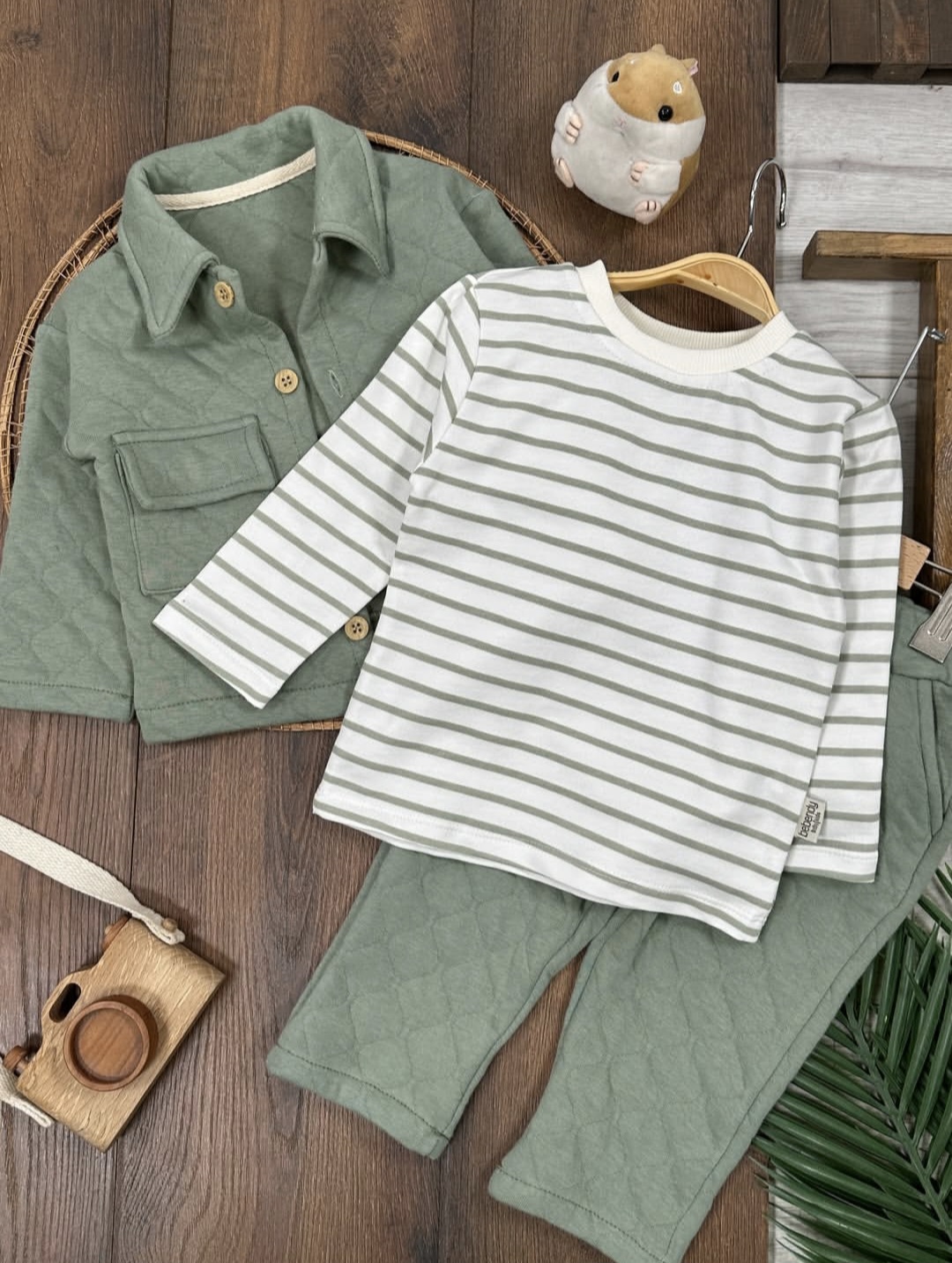 Moderan i praktičan prolećni komplet za bebe u maslinastoj boji, koji se sastoji od lagane proštepane jaknice, bluzice sa diskretnim prugama i udobnog donjeg dela. Idealan izbor za prelazni period, šetnje i svakodnevne aktivnosti. Materijal je mekan i prijatan za nošenje, jaknica se moze nositi i kao sako.