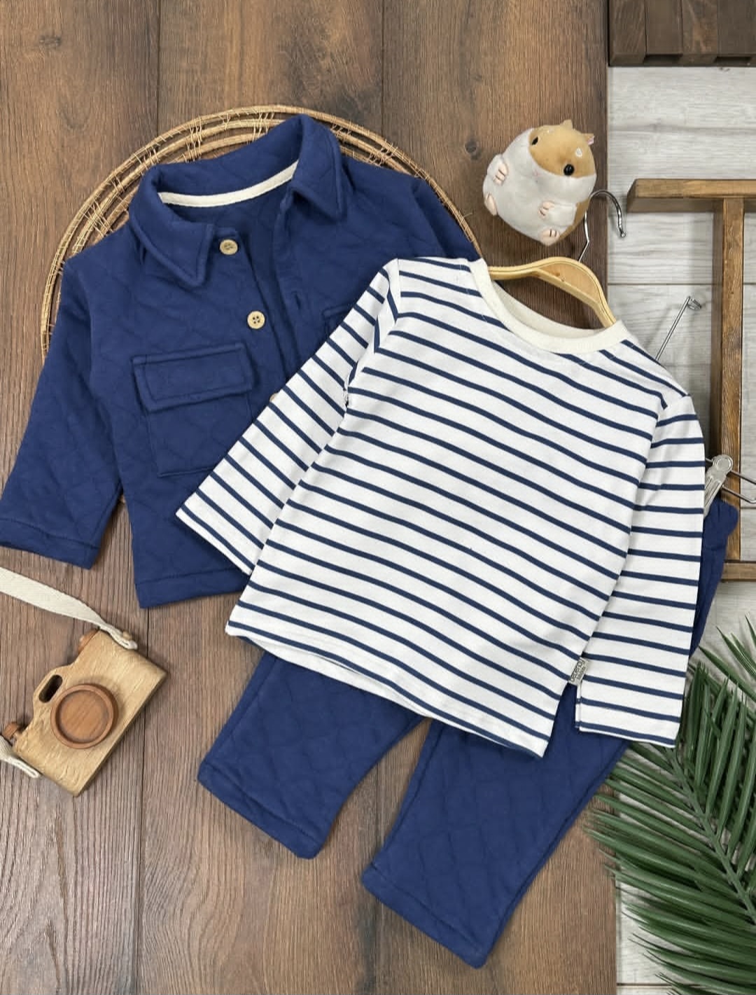 Praktičan i moderan prolećni komplet za dečake u teget boji, koji se sastoji od lagane jaknice, bluzice i udobnog donjeg dela. Idealan za prelazni period i svakodnevne aktivnosti, ovaj set pruža udobnost i slobodu pokreta, uz klasičan i lako uklopiv dizajn. Savršen izbor za šetnje, vrtić i svakodnevno nošenje.