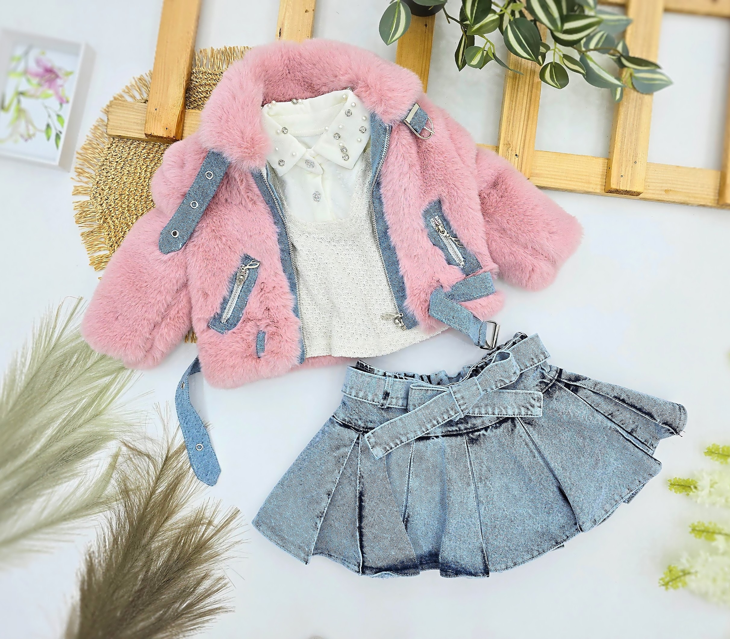 Elegantni komplet za devojčice koji spaja toplinu i stil. Set sadrži roze bundicu sa detaljima od teksasa, plisiranu teksas suknju sa kaišem i beli džemper sa kragnicom ukrašenim biserima. Savršen za svečane prilike, proslave i modne kombinacije.