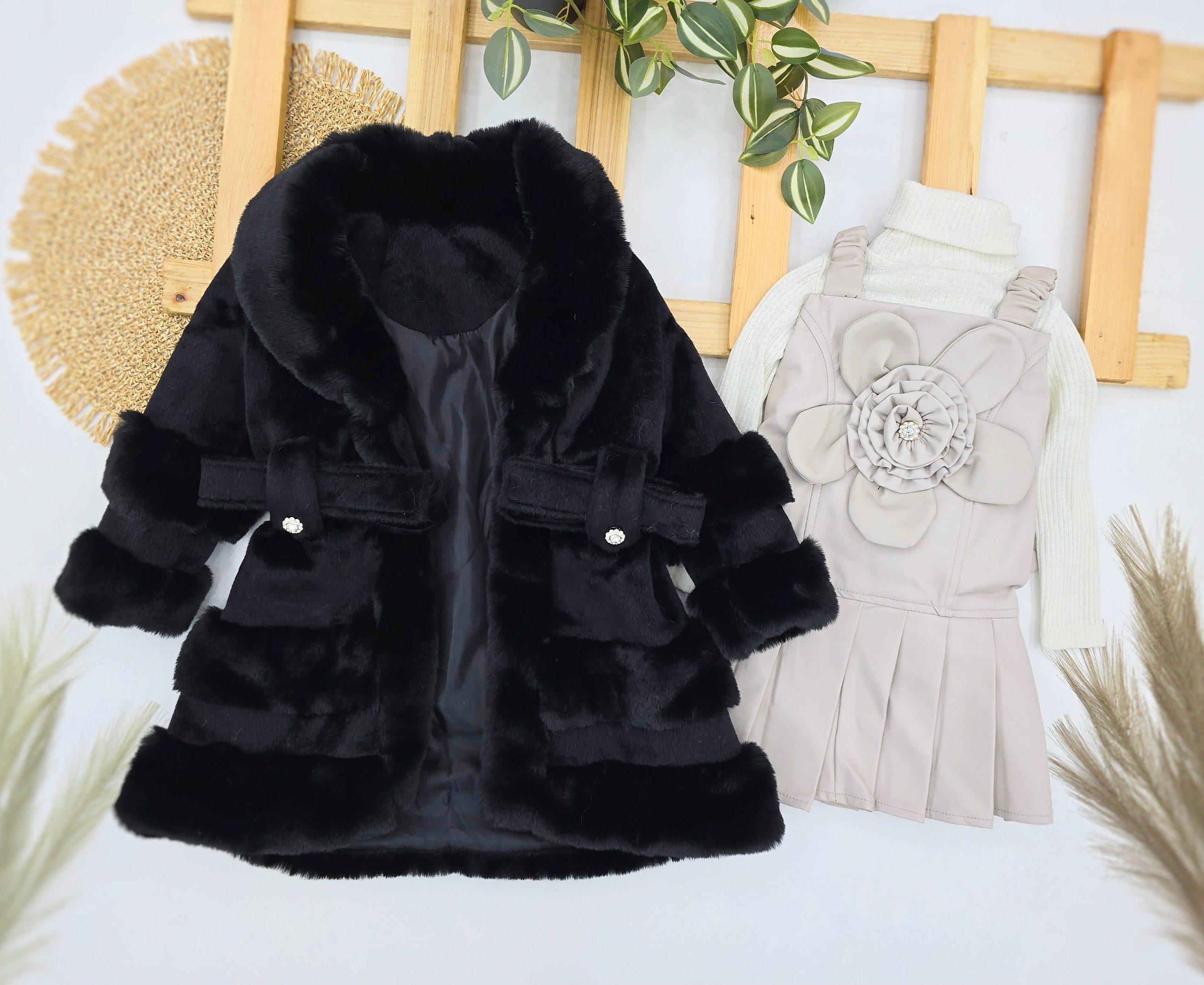 Set za devojčice – crni kaput sa krznom, haljina od eko kože i bela rolka