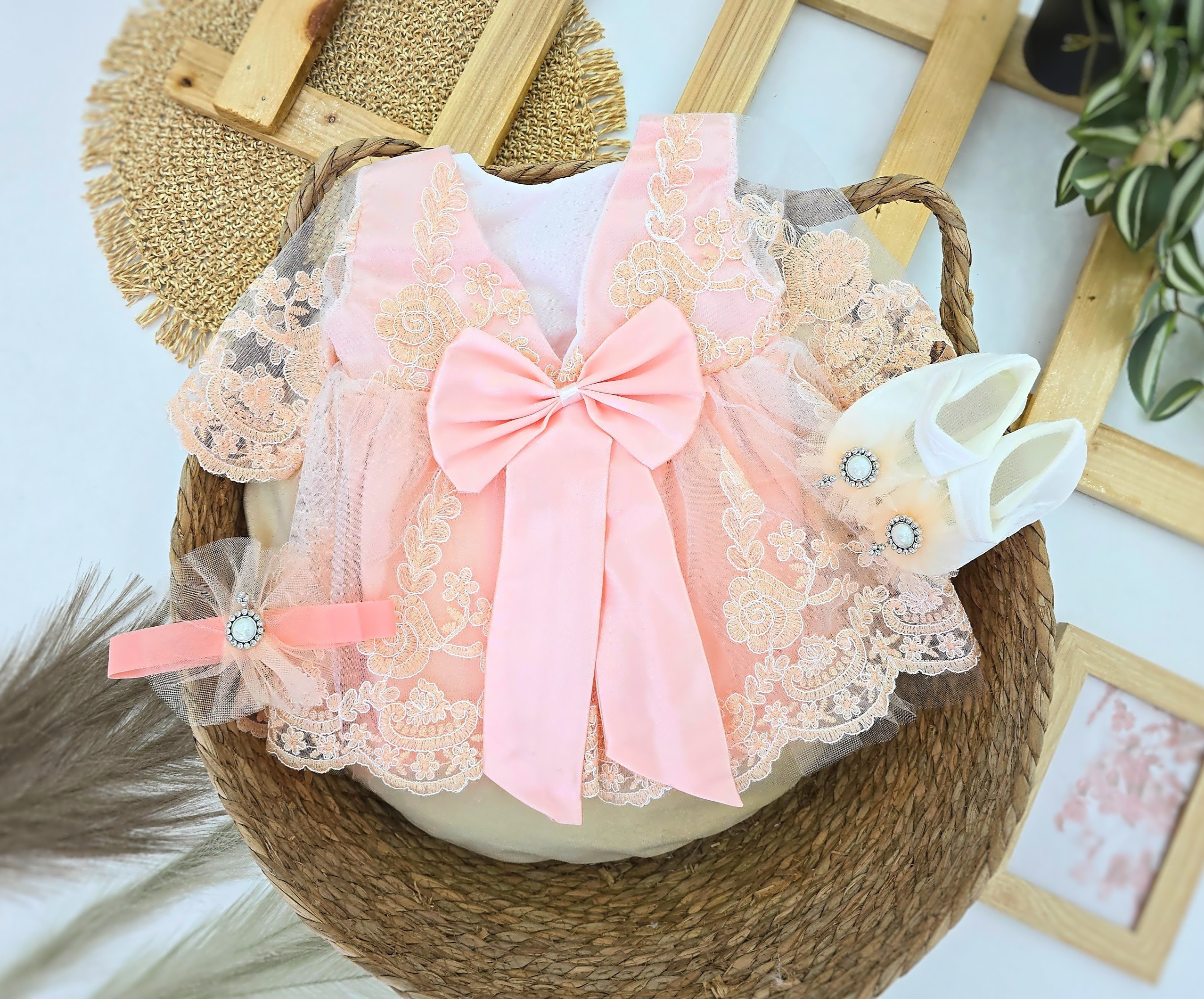 Informacije o proizvodu "Svečana haljina za bebe sa cipelama i trakom – komplet u kutiji"
