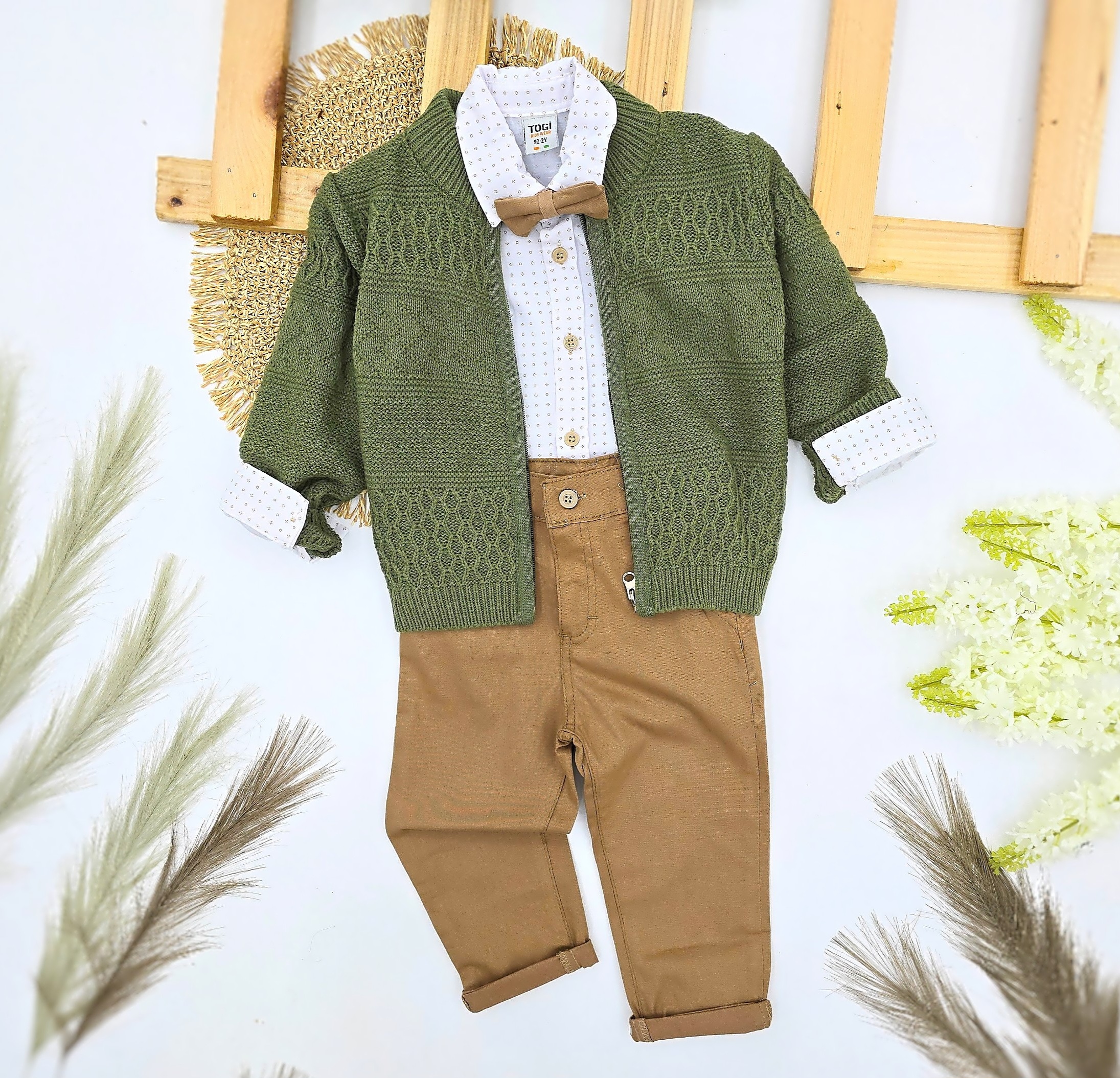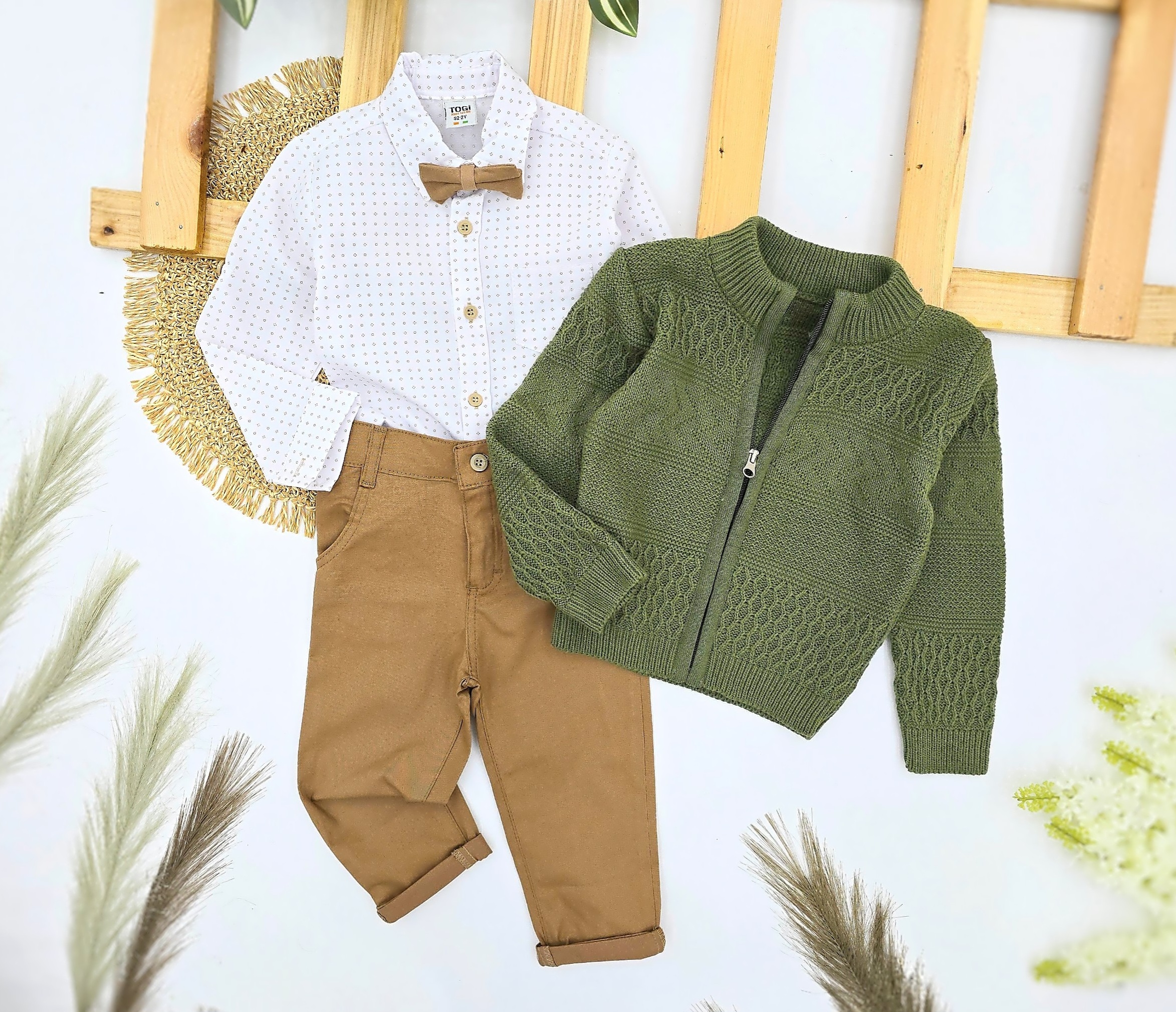 Prelep svečani komplet za dečake u modernim zemljanim tonovima. Sastoji se od bele košulje sa sitnim detaljima, bež pantalona, leptir mašne i maslinastog pletenog džempera na raskopčavanje.