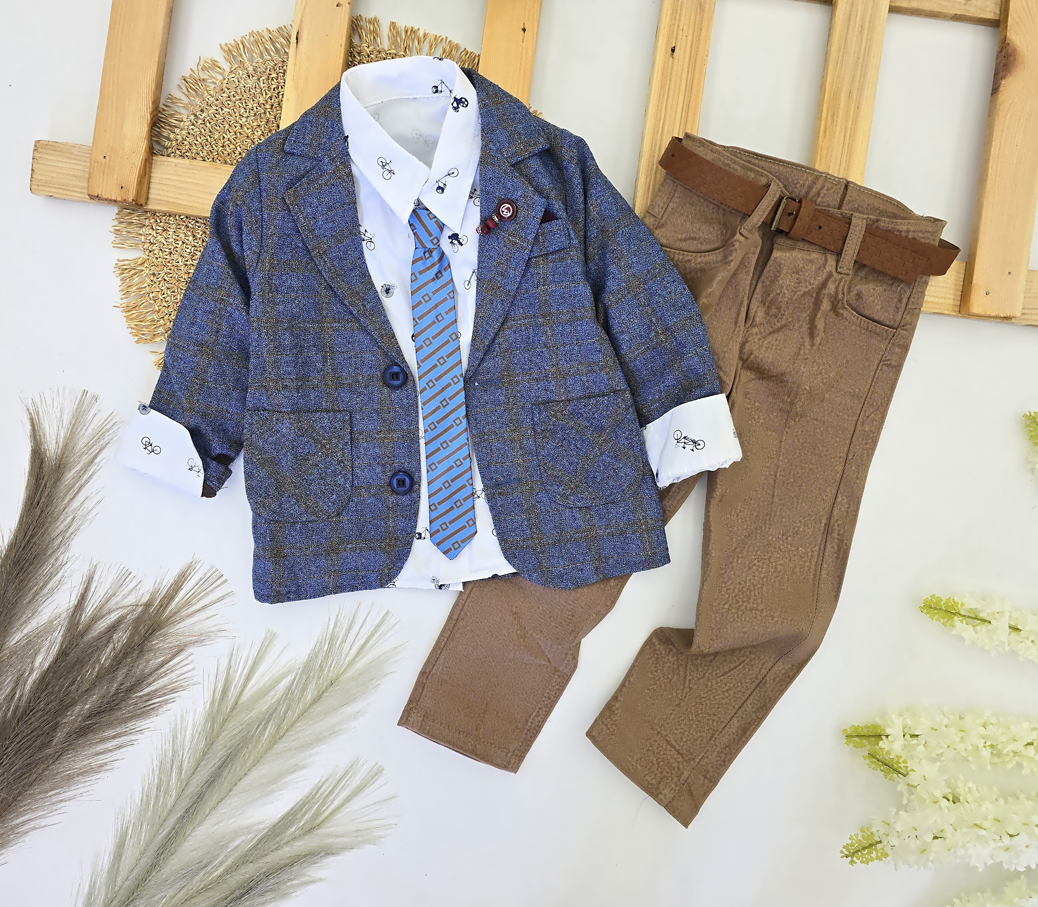 Informacije o proizvodu "Svečani komplet za dečake – teget sako, krem pantalone, košulja i kaiš"