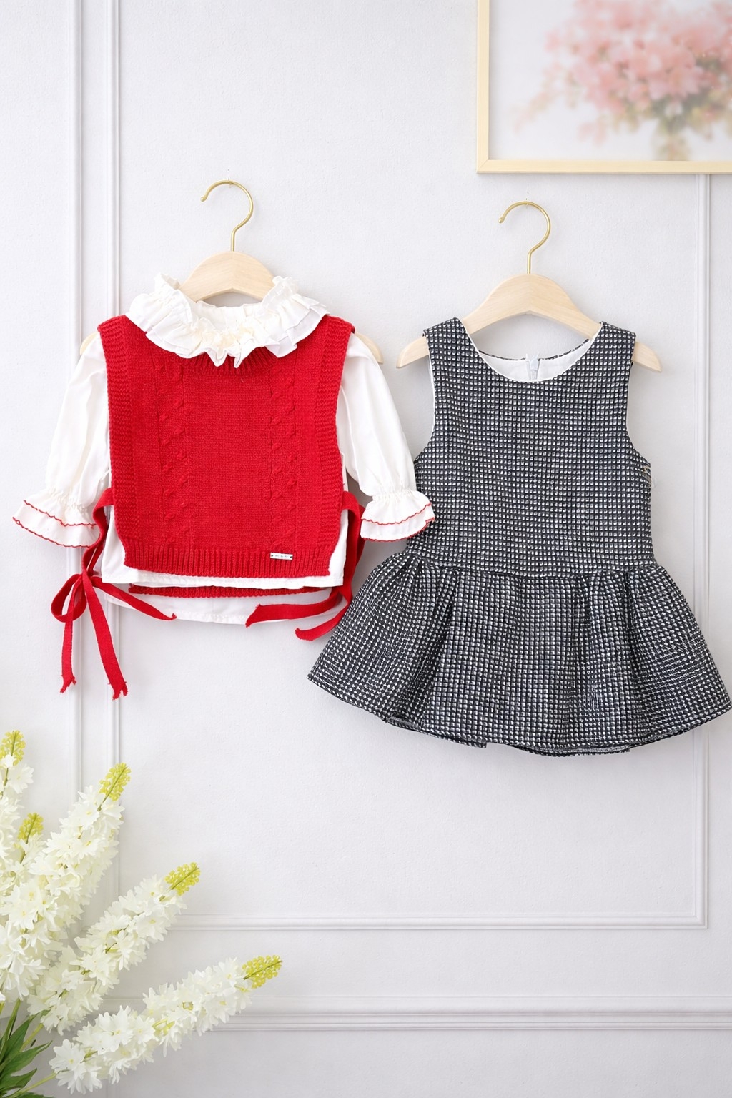 Elegantni trodelni komplet za devojčice koji uključuje romantičnu košulju sa karnerima, modernu haljinu i pleteni prsluk. Idealan za svečane prilike, proslave ili modne kombinacije tokom hladnijih dana.