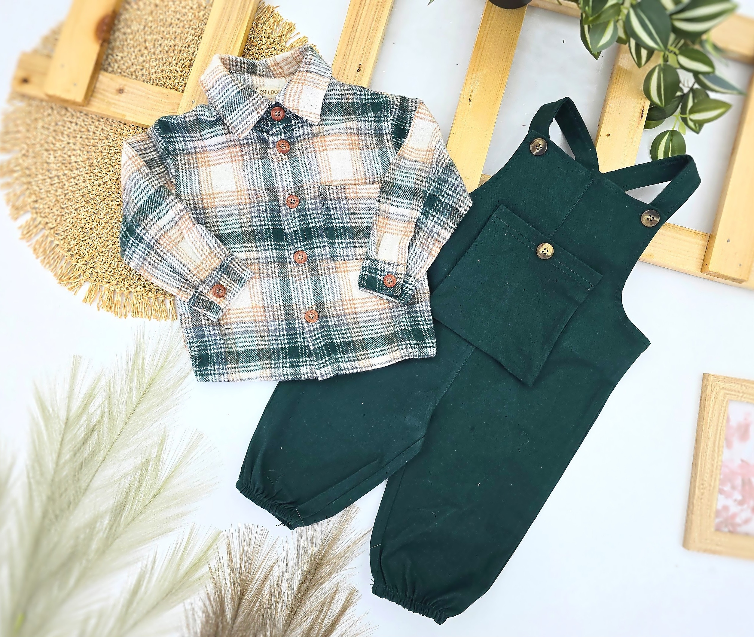 Trodelni komplet za bebe dečake – zeleni tregeri, karirana košulja i kačket