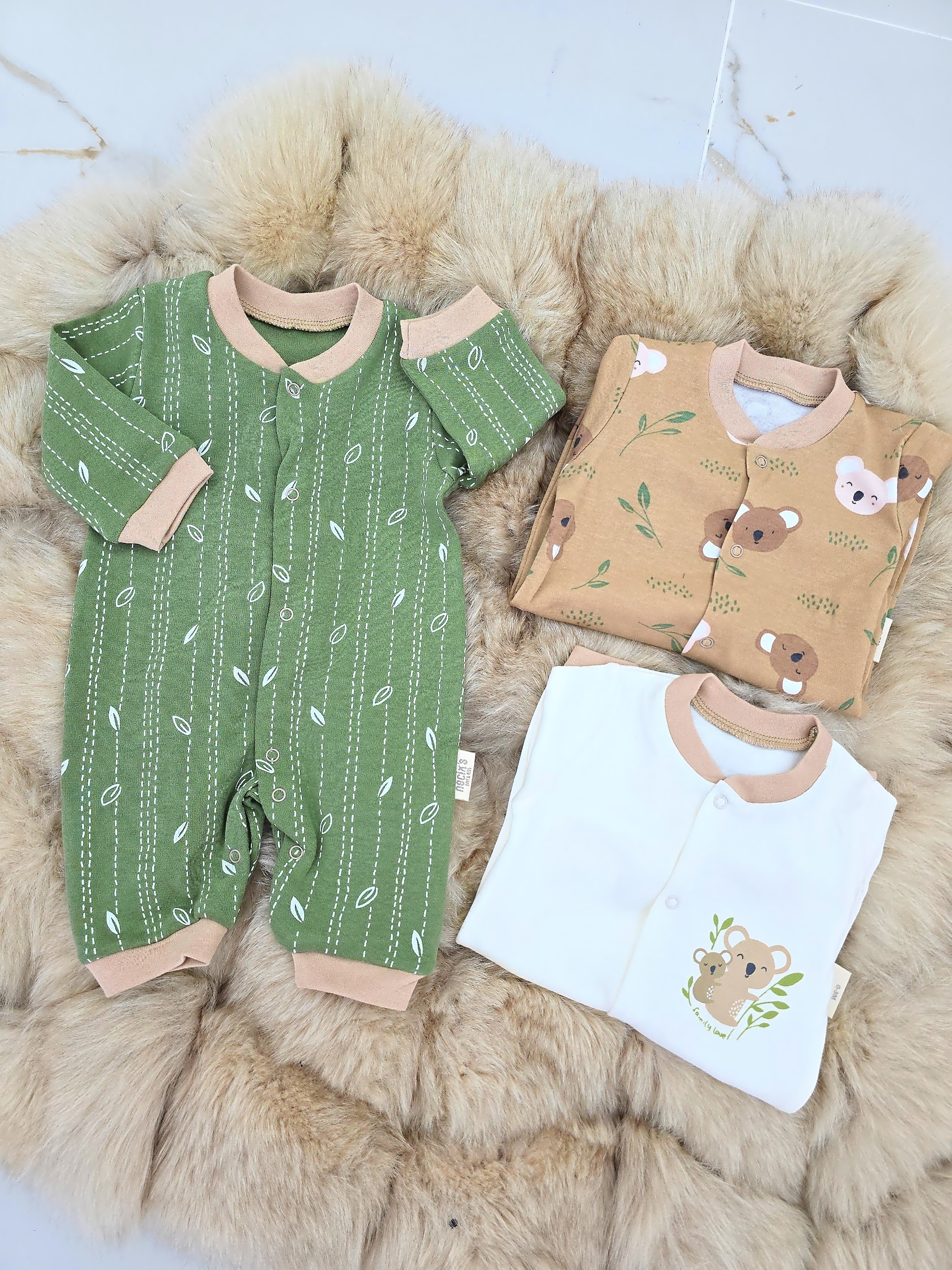 Trodelni komplet za bebe sa tri štrample u različitim dezenima sa slatkim motivima koale 🐨. Izrađene od 100% pamuka – mekane, udobne i savršene za svakodnevno nošenje, spavanje i maženje. Idealne za nežnu kožu novorođenčeta.