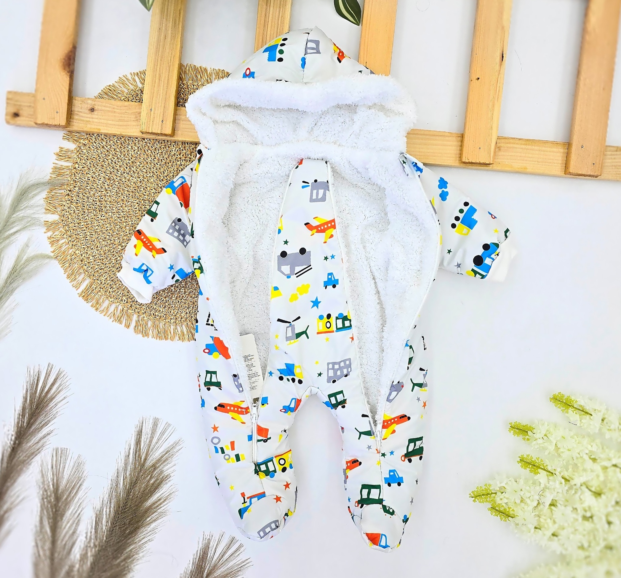 Informacije o proizvodu "Zimski skafander za bebe dečake – beli sa autićima"